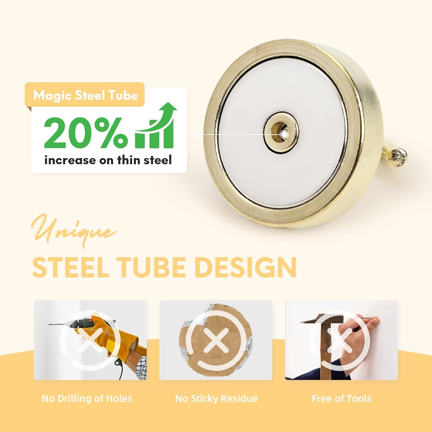 - ✔MAGIC STEEL TUBE DESIGN - Unique design of steel tube inside the base of magnetic hooks greatly increases the attractive force , especially on thin steel! It increase approximately 20% force comparing those none-tube magnets. it solves the problem of weak force on thin steel. Permanent magnetic hook with magic steel tube, strong magnetism lasts forever!
