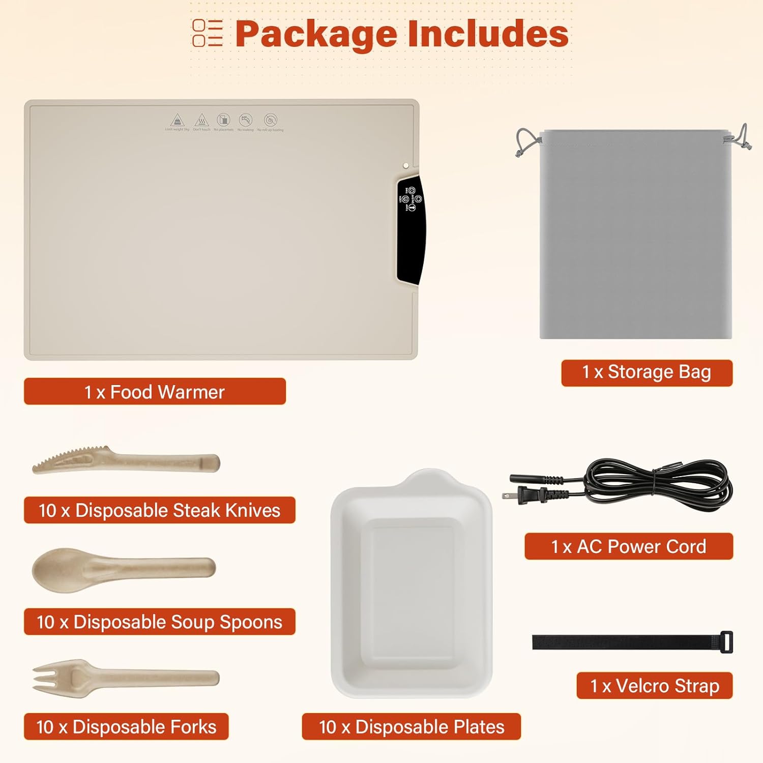 - Durable and Portable: Made from durable food-grade silicone, easy to clean, roll up, and carry. Includes 1 x Food Warmer, 10 x Disposable Plates, 10 x Disposable Steak Knives, 10 x Disposable Forks, and 10 x Disposable Soup Spoons