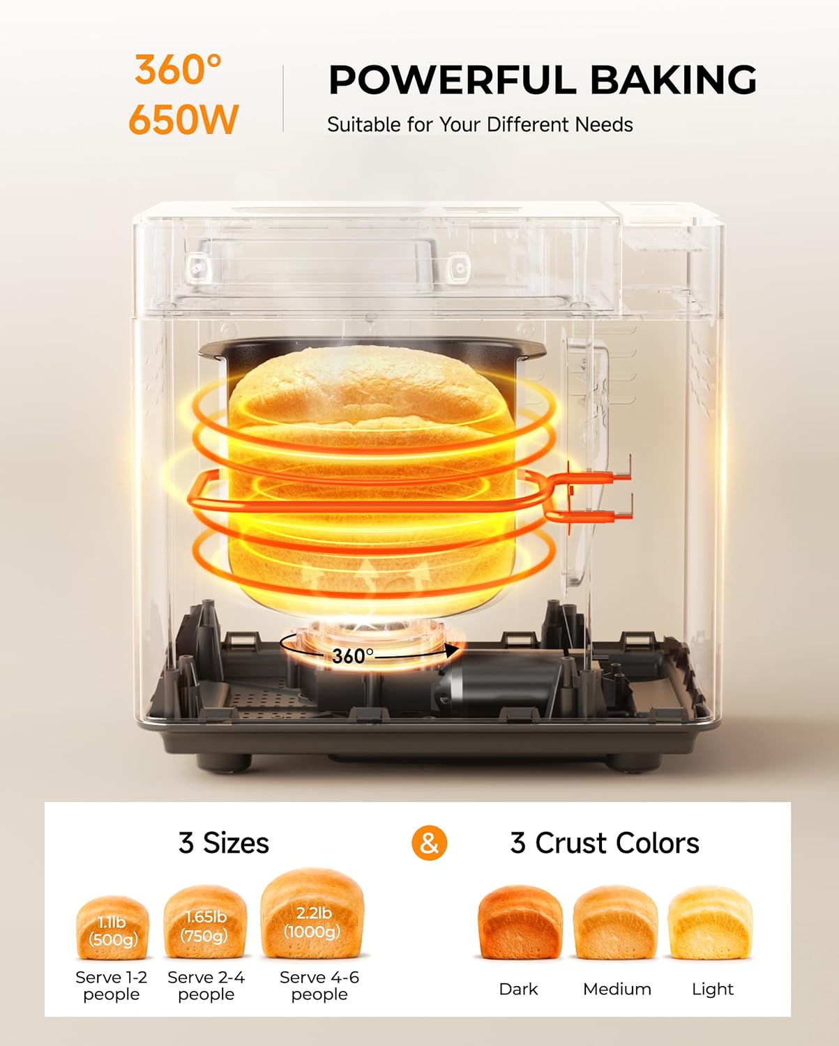 - 𝟔𝟓𝟎𝐖 𝐏𝐨𝐰𝐞𝐫𝐟𝐮𝐥 𝐇𝐞𝐚𝐭𝐞𝐫 𝐖𝐢𝐭𝐡 𝐐𝐮𝐢𝐞𝐭 𝐌𝐨𝐭𝐨𝐫: Our bread making machine with 650W motor is able to provide you the rapid baking, and you can enjoy your bread in less time by using our ultra fast mode, and ensures even heat distribution for perfectly golden 360° crusts with a soft, fluffy interior. Moreover, our automatic bread maker's advanced noise reduction technology can minimize noises to 60 dB, making it an excellent choice for those who prefer to bake early in the morning or late at night