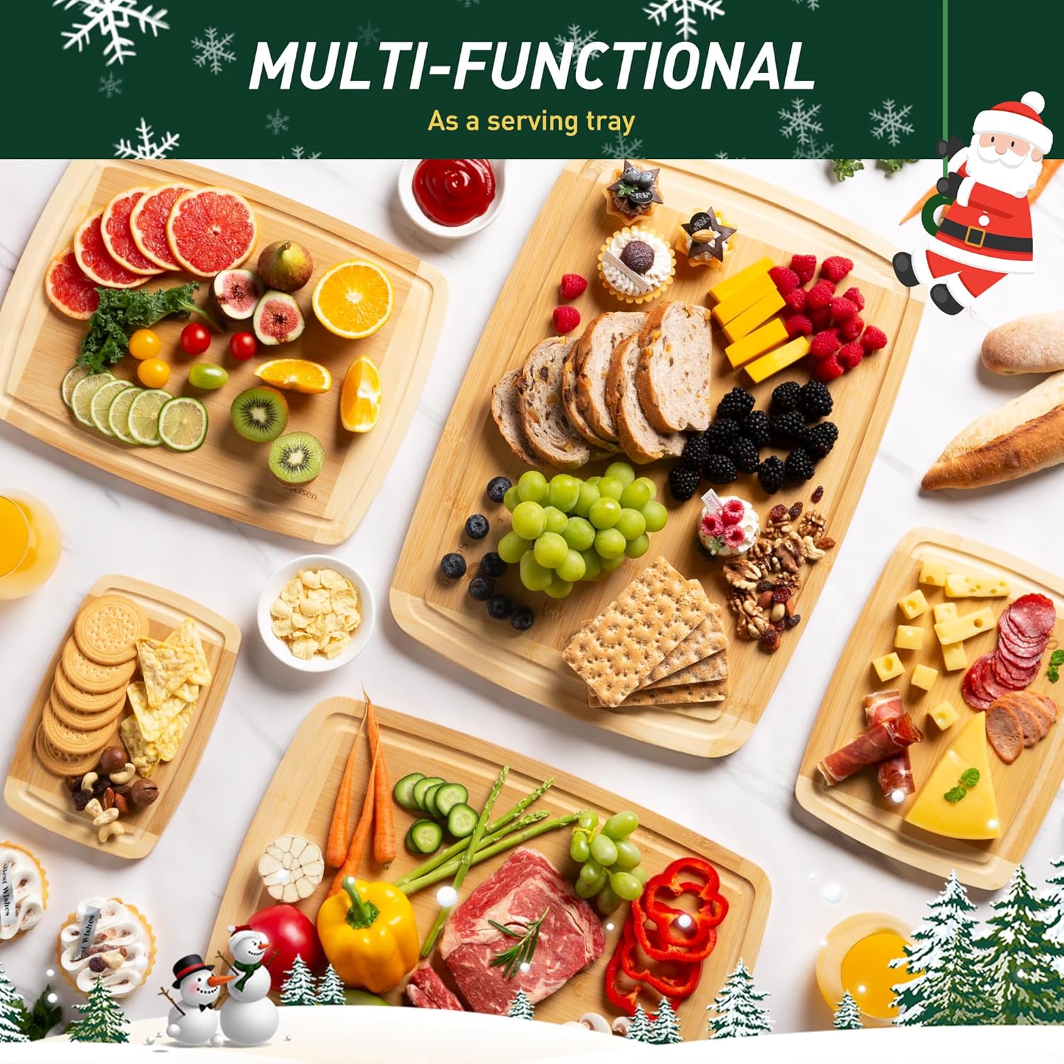 - Perfectly Sized for Versatile Use: Our bamboo cutting board set has five sizes – 9"x6", 11"x8.5", 14.5"x11", 17.5"x12" and 19.5"x14" . This set of 5 bamboo cutting boards are perfect for everyday food preparation, from slicing fruit to chopping veggies. Thoughtfully sized to fit different needs without taking up too much counter space. Whether dicing veggies, slicing fruits, or carving meats, there's a chopping board for every occasion. Perfect for various kitchen tasks and charcuterie boards.