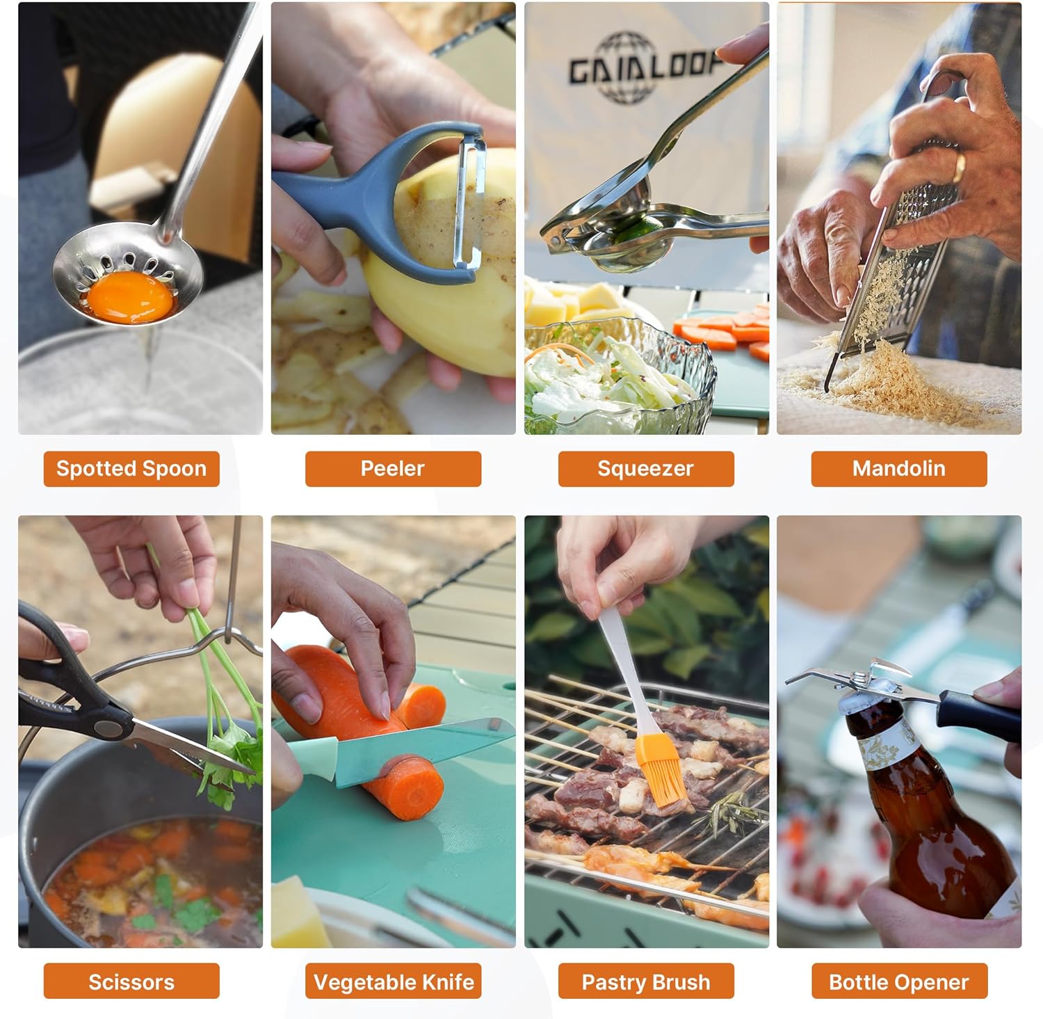 - 【Cookout Essential: RV/BBQ/Camping】Gaialoop 32 PCS Cooking Utensil Set covers most of the cooking utensils you will need in a cookout scene, excellent cooking equipment on the go. It can be used in a RV kitchen, a backyard barbecue parties or a family camping trip. This is a must have camping cooking accessories for people who enjoy glamping with friends or families.