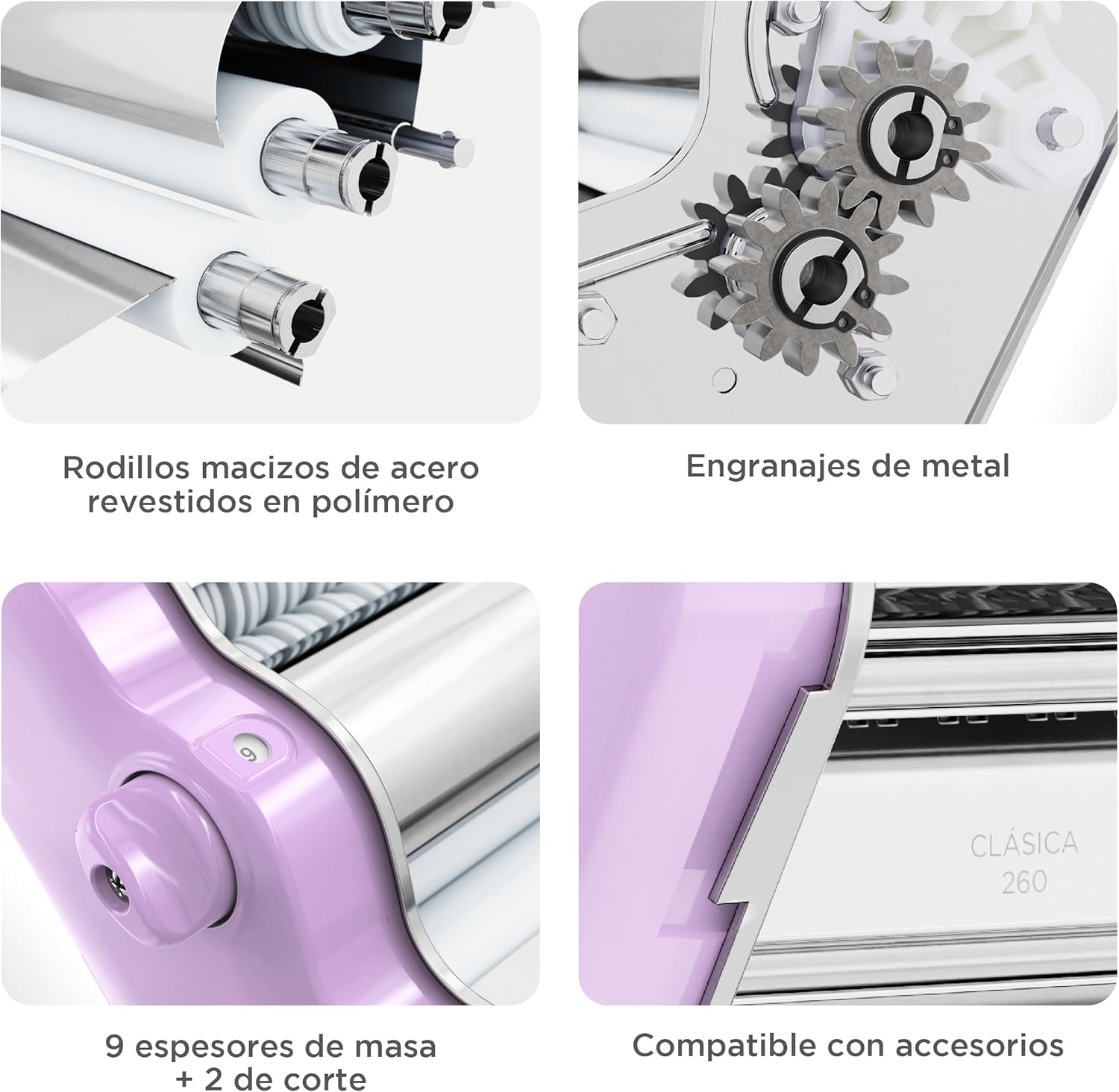 PASTALINDA Classic 260 Pasta Maker Machine, 26 cm Wide Rollers, 9 Thickness Positions, 2 Cutting Positions, Stainless Steel. Includes Reinforced Hand Crank And Two Clamps (Lilac)