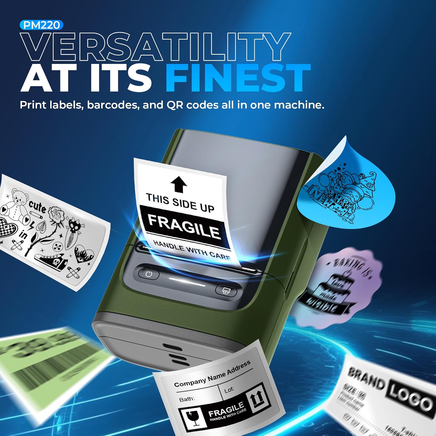 - Powerful APP- The PM220 label maker machine with tape comes with label templates and can set up your own templates. Please do not tear or destruct the green sticker on the back of the label strip, otherwise it will affect the printing effect. This label printer allows you to customize and format labels, supporting various features such as QR codes, barcode labels, tables, materials, time, figures, text, icons. This label maker machine with tape APP included more than 90 +Fonts, 14+ Languages, 450+ Materials