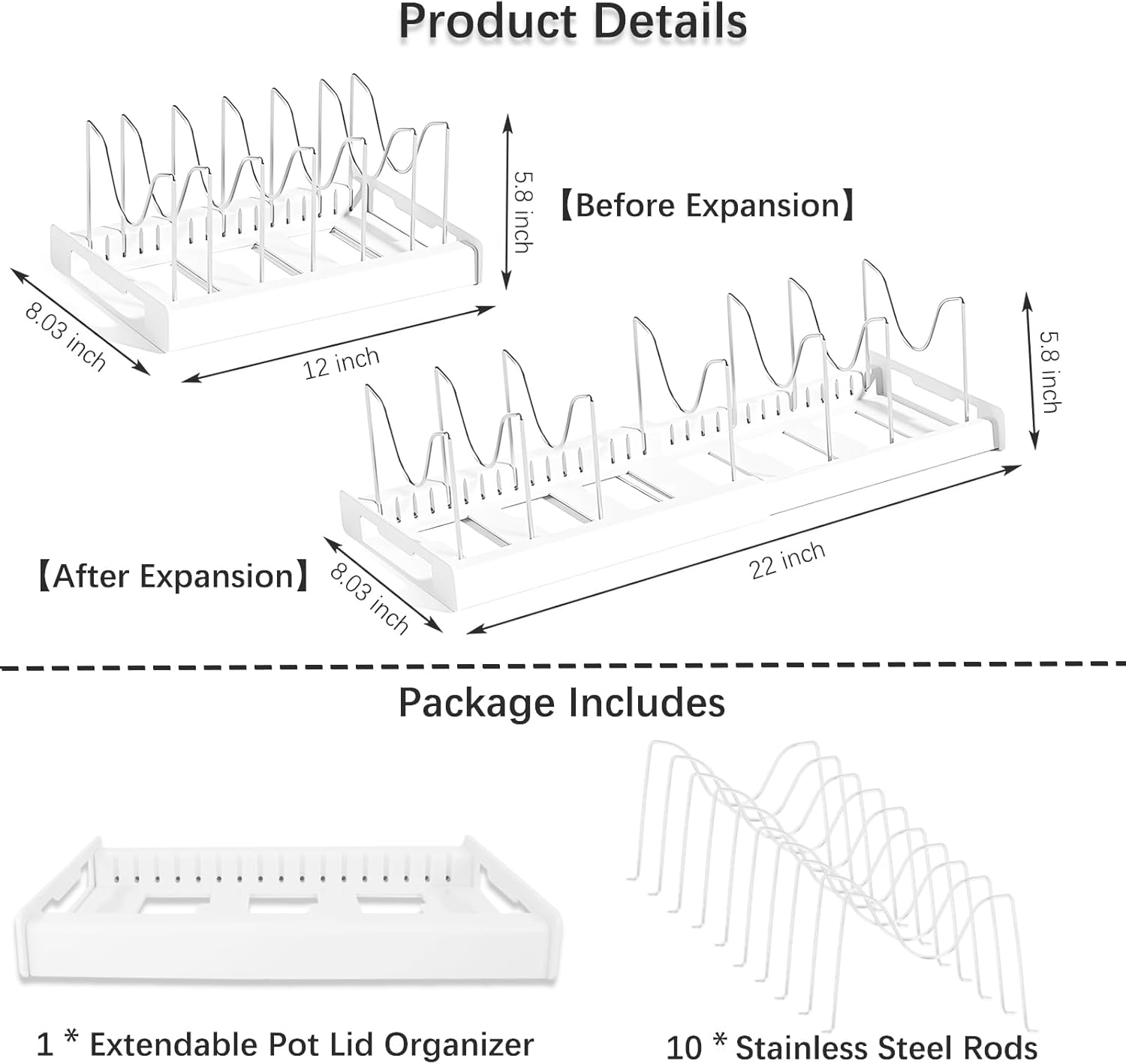 - EXTENDABLE POT LID ORGANIZER - The pot organizers inside cabinet expands from 12''-22'' wide to maximize you can set this pan organizers inside cabinet to the size you want space in any cabinet