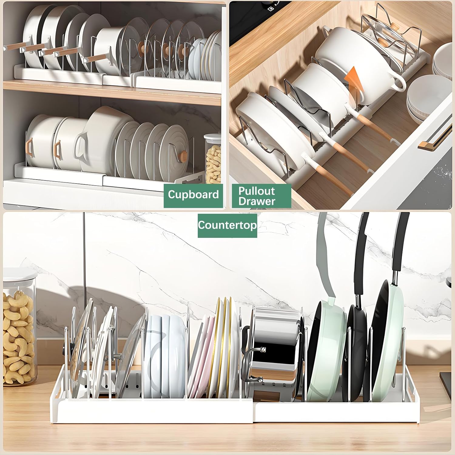 - Note: We recommend that you measure the size of your cabinet or drawer before purchasing our Expandable Pots and Pans Organizer rack to see if it can accommodate your pots and pans. Note: Due to manual shooting, the picture may be slightly different from the actual color, please understand
