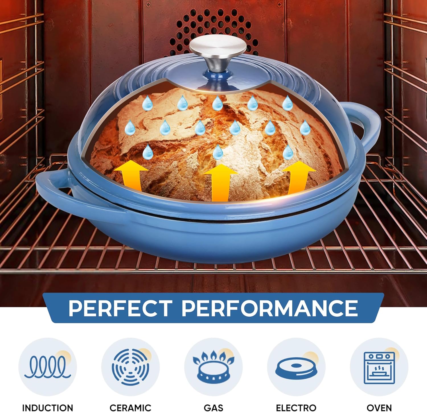 E-far Dutch Oven for Sourdough Bread Baking, 6 Qt Round Enameled Cast Iron Dutch Oven for Homemade Artisan Bread, Dome Lid & Shallow Base, Matte Black Interior & Durable, Oven-Safe to 500℉, Blue