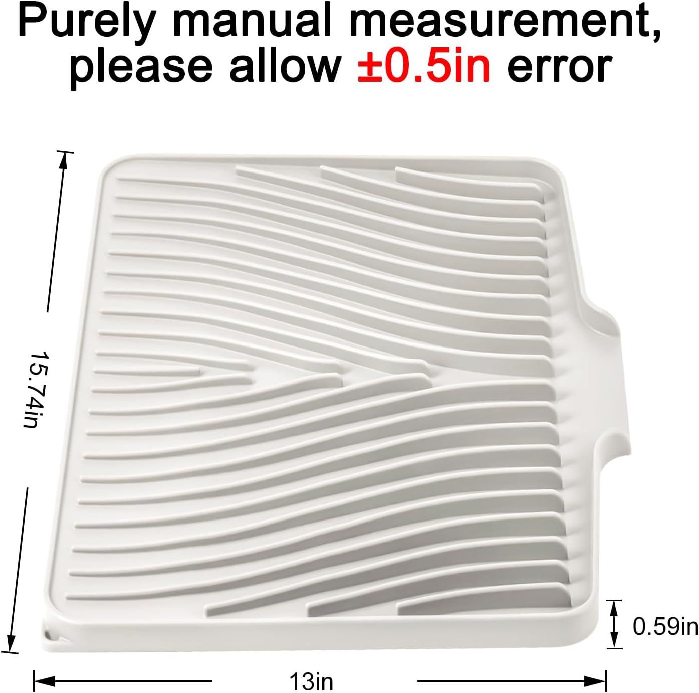 - Quick Drying Mat: TIKNIK dish drying mat measures 15.8" x 13", where washed dishes can be placed for air drying. The folding, raised and innovative design of the quick dry dish mat allows air to circulate under the dishes,and features unique diagonal ridges to easily remove moisture, and a specially designed rim that lets water drain directly into the sink. This keeps your countertops dry and clean, and says goodbye to wet countertops.