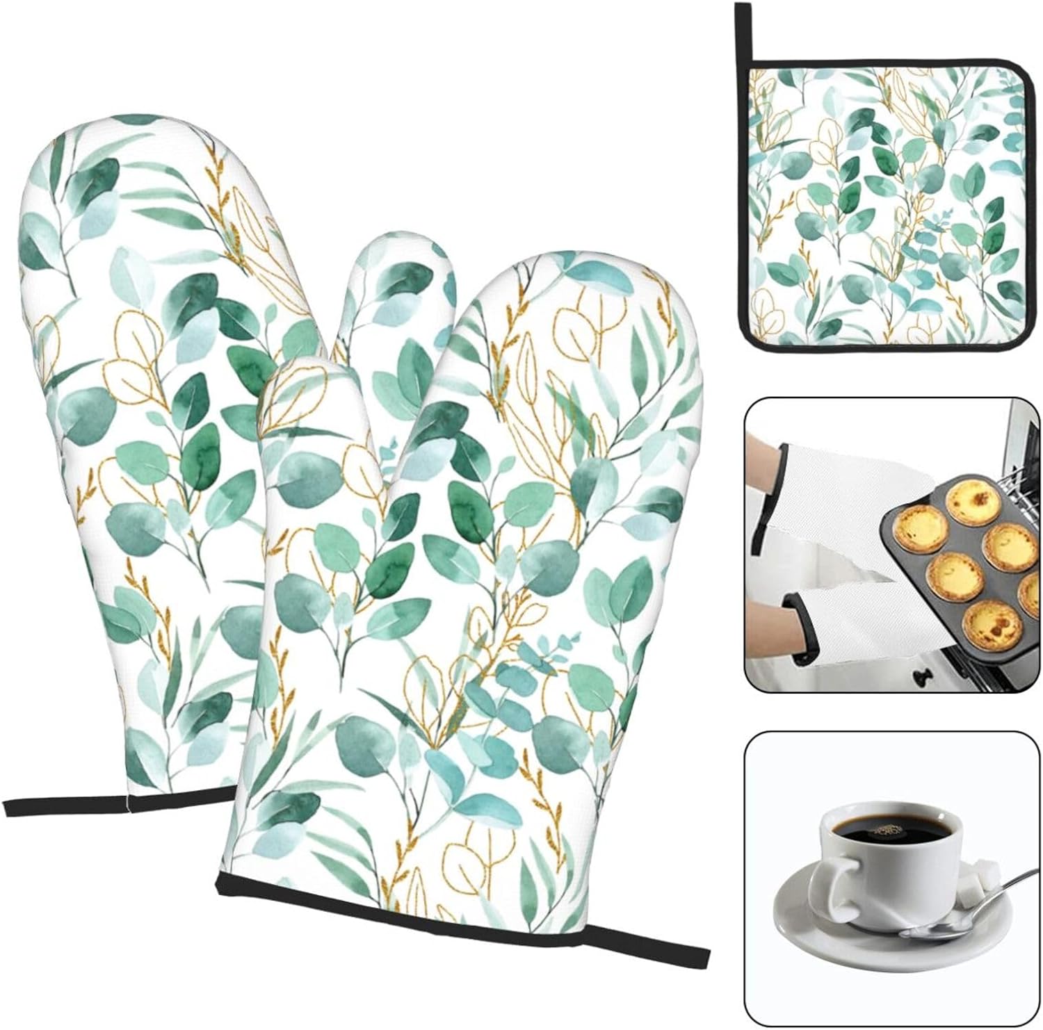 Sage Green Leaves Oven Mitts and Pot Holders Sets Heat Resistant for Kitchen BBQ Microwave Baking Grilling Cooking Set of 3 Cute Botanical Kitchen Oven Glove