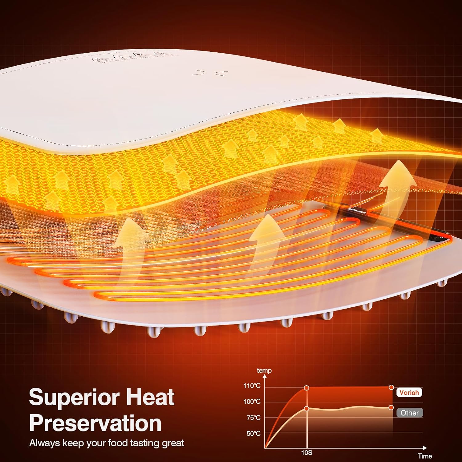 - 【Usage Tips】To ensure optimal performance and safety, we recommend always using a heat-insulating pad when placing the food-warming silicone mat on surfaces like quartz, marble, or artificial stone, as localized heat may cause damage. For surfaces like stainless steel, solid wood, or heat-resistant ceramic tiles, you can use the mat directly for the best results.