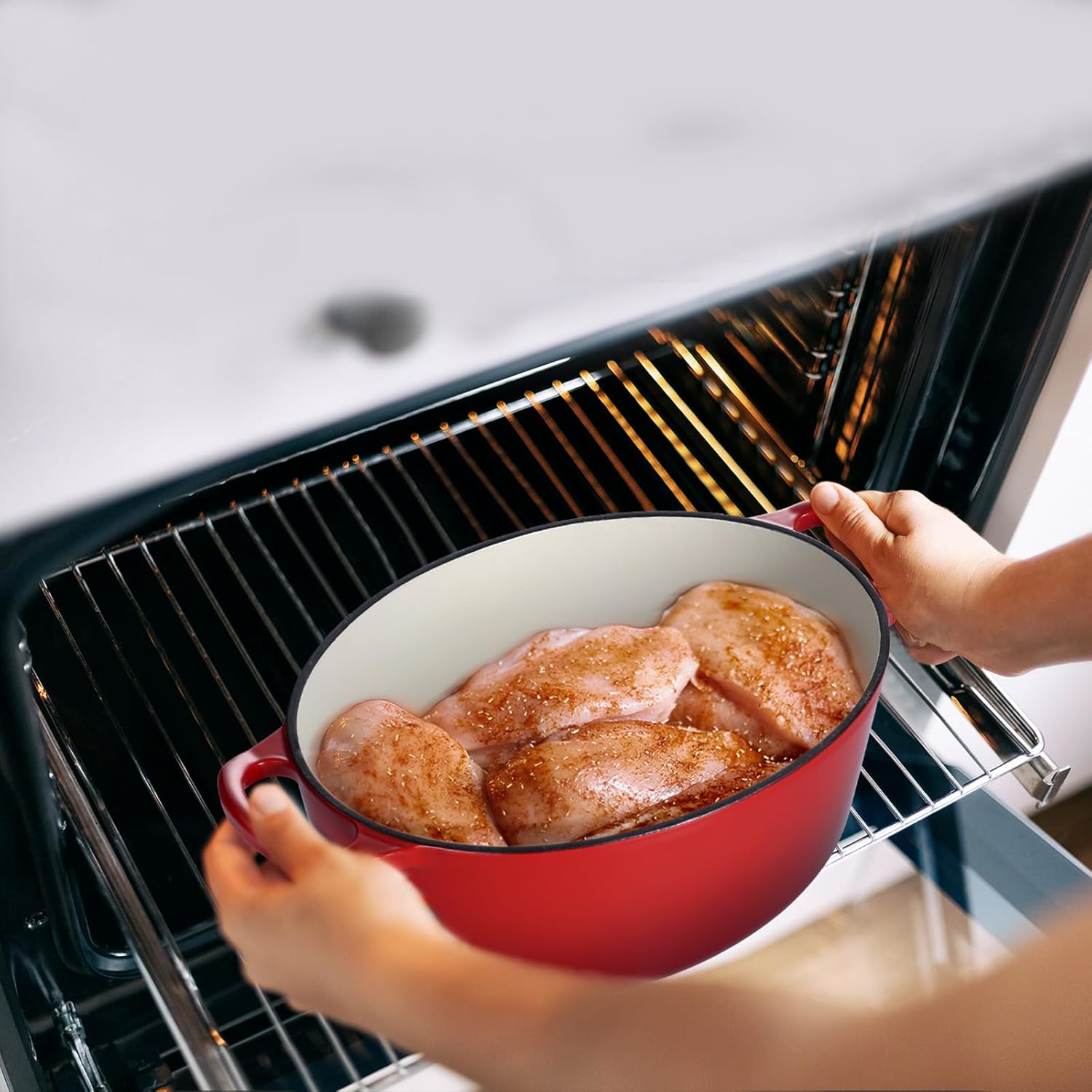 - Superior Heat Retention, our Dutch oven for bread baking ensure even heat distribution and retention, evenly heating throughout both the bottom and sidewalls, oval Dutch oven also reduces the amount of energy needed for cooking, ensuring perfect roasts, stews and baked bread every time. Oven Safe up to 500℉