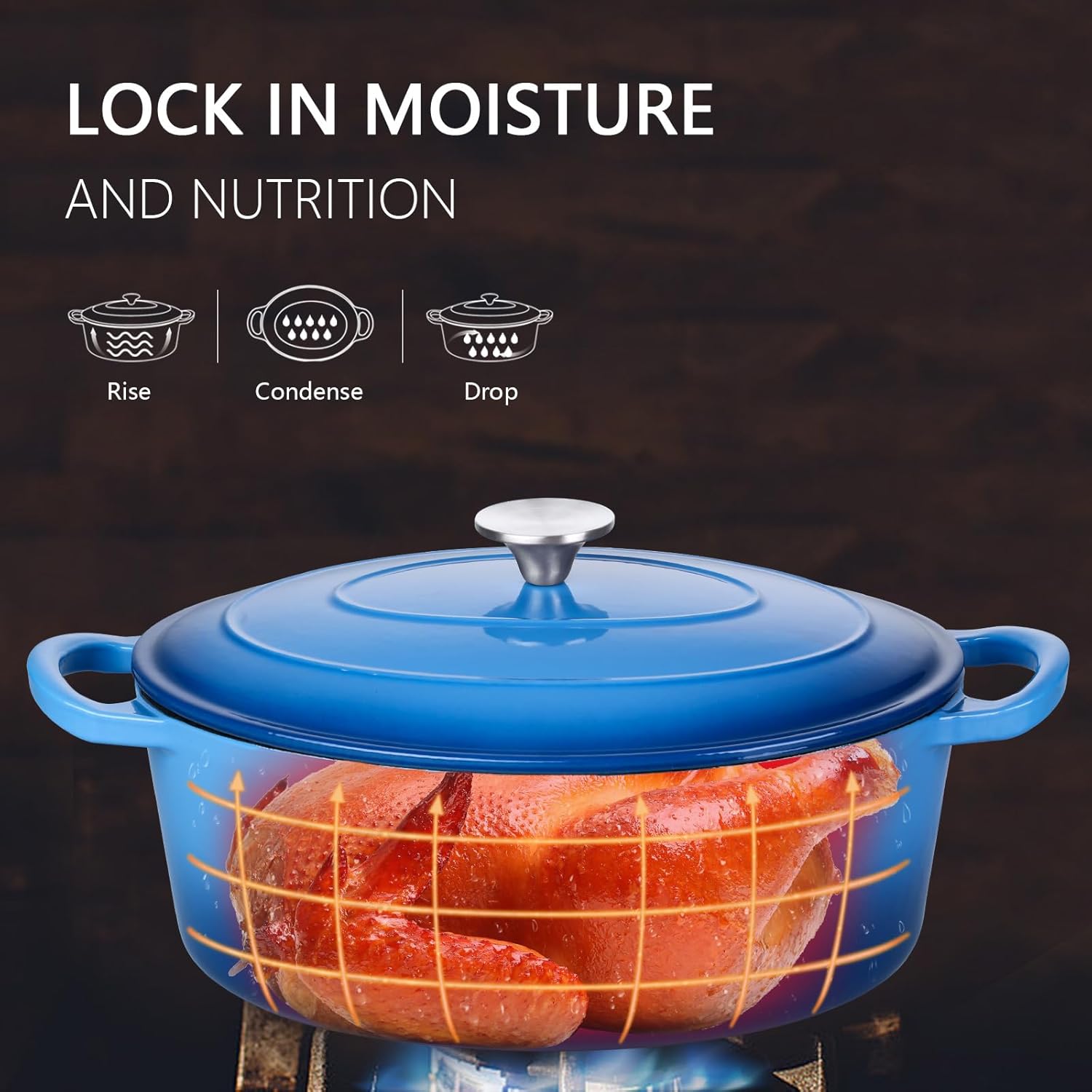 5QT Oval Dutch Oven Pot with Lid, Leonyo 5 Quart Enameled Oval Cast Iron Dutch Oven for Sourdough Bread Breaking, Heavy Duty Cookware for Braising, Stews, Roasting, Blue