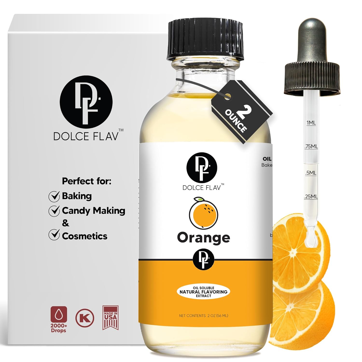 Dolce Flav Natural Orange Extract – 2 Ounce Oil-Soluble Kosher, Sugar-Free, Concentrated Citrus Flavor for Candy, Chocolates & Desserts, Includes Measured Dropper