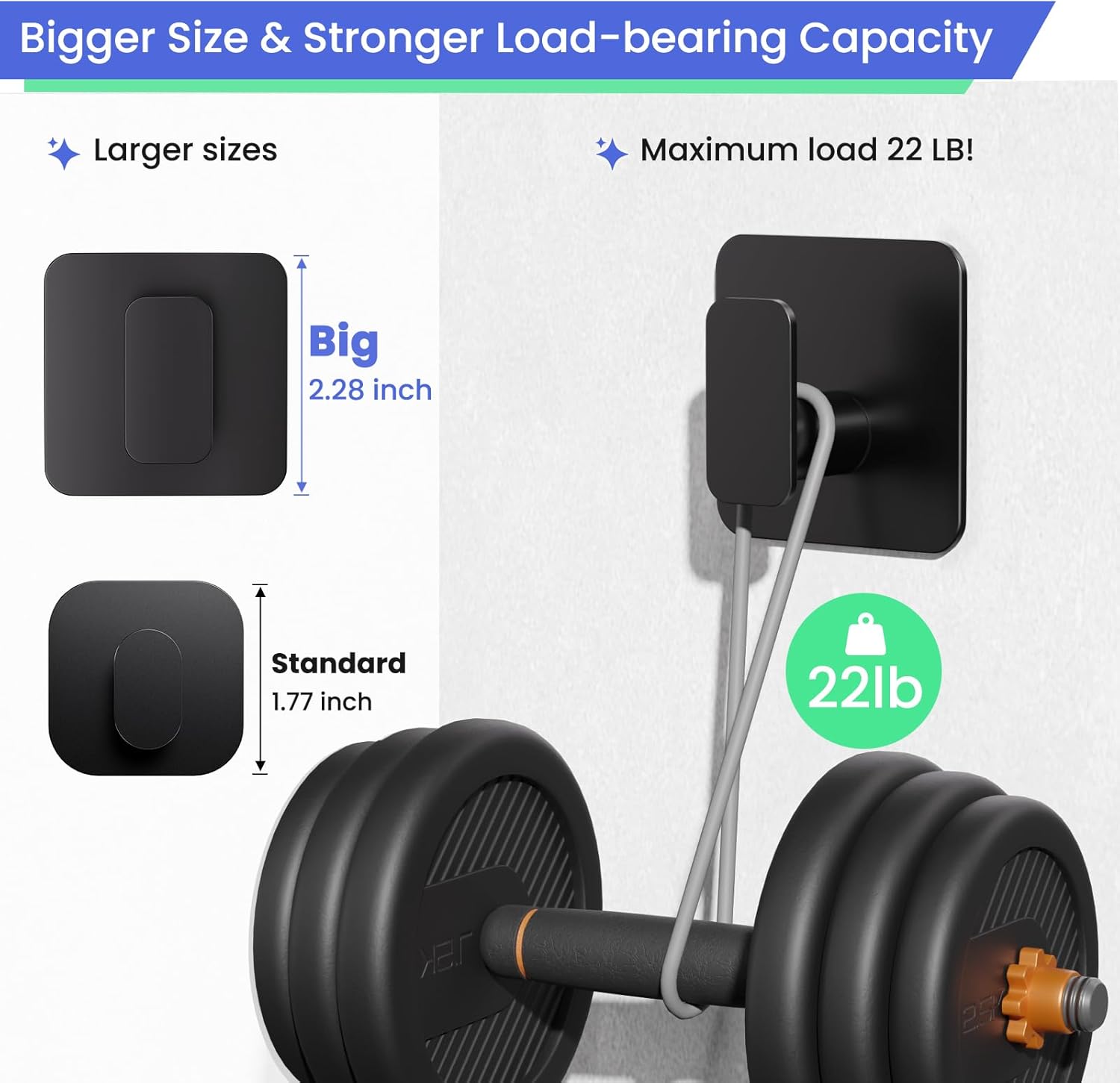 - 【22lb Super Strong Load Capacity】 Wall hooks maximum load capacity up to 22lb/10kg, solid bonding does not fall off, strong adhesive backing can be firmly affixed to tiles, glass, marble, wood and other smooth surfaces, easy to hang toolboxes, kitchen pots and pans, and other heavy objects, do not need to worry about the risk of falling.