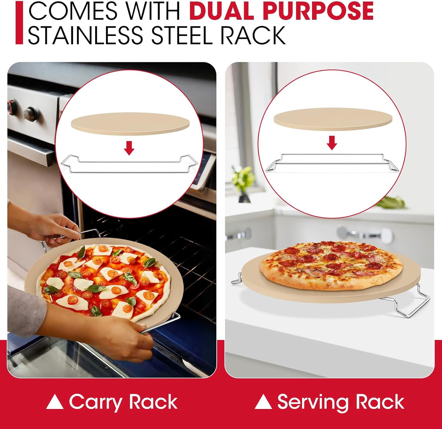 Unicook 15 Inch Round Pizza Stone for Oven and Grill, Oven Baking Stone for Bread, Cordierite Pizza Pan for Baking Crispy Bread, Pie and Cookies, Includes Carry Rack and Dough Scraper