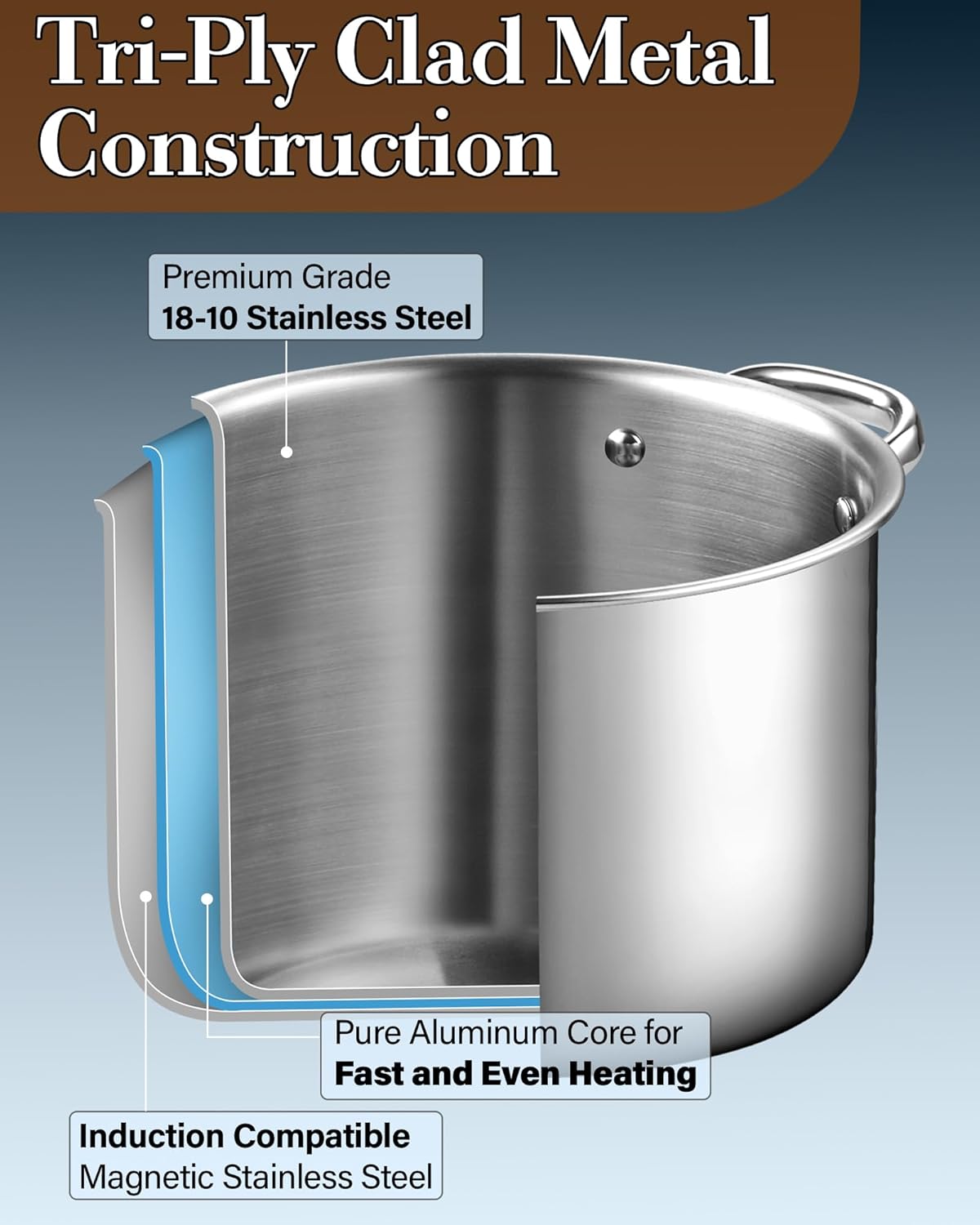 - Tri Ply Clad: 7 quart dutch oven stockpot is made of 18/10 stainless steel, aluminum and a metal outer layer, which ensures good thermal conductivity and even heat distribution, helping food heat up quickly and evenly
