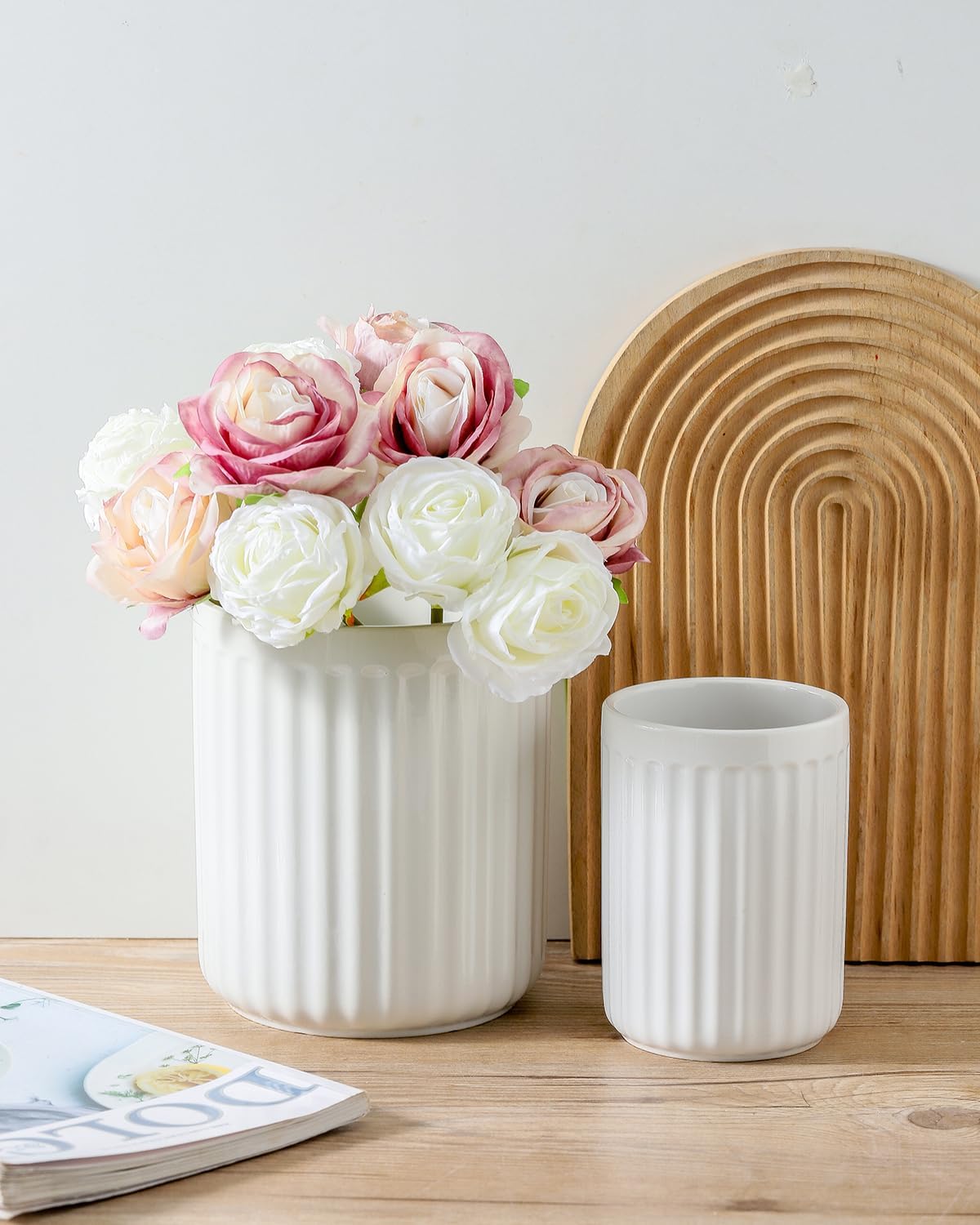 Hasense Utensil Holder Set of 2, 7.3" + 5.7" Farmhouse Utensil Holder for Kitchen Countertop, Stable Ceramic Utensil Crock for Christmas & Housewarming Gift, Spatula Holder for Counter, White