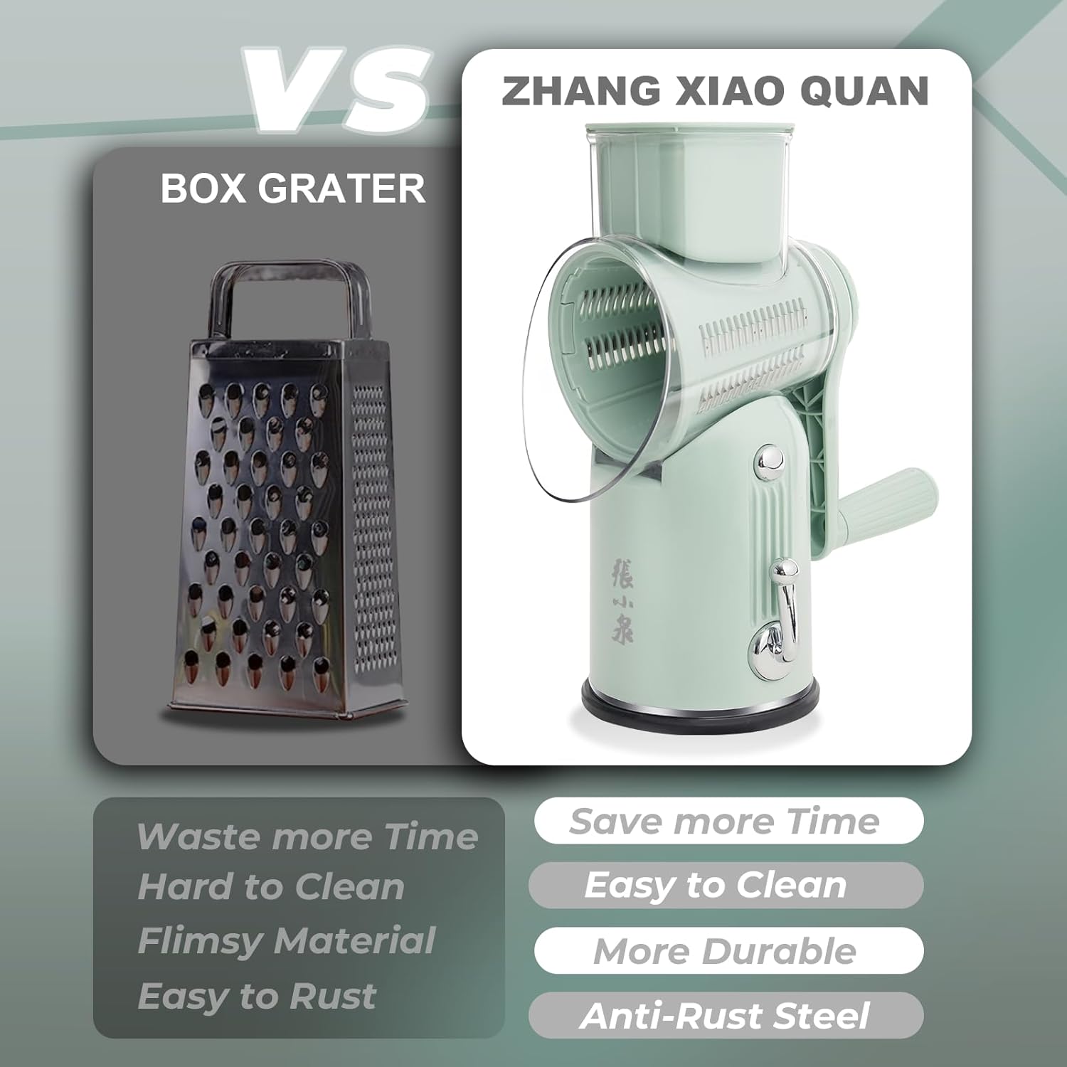 ZHANG XIAO QUAN SINCE 1628 5-in-1 Interchangeable Blades Rotary Cheese Grater Hand Crank, Cheese Shredder Mandoline Vegetable Julienne Slicer Cutter Nut Chopper with Anti-Slip Base, Blade Storage