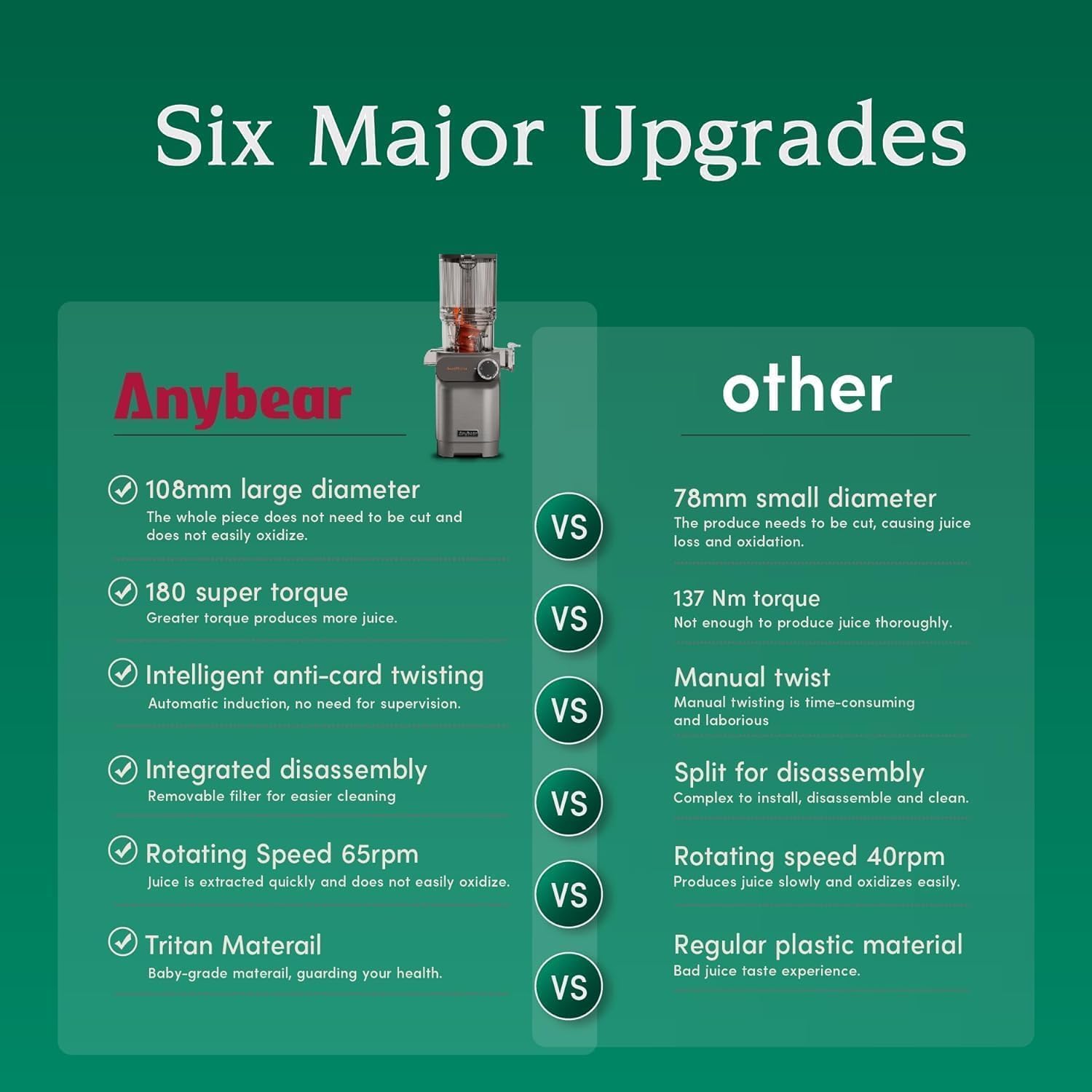- 【180nm HIGH-TORQUE, 200W Powerful Motor】 Anybear masticating juicer machine with a high torque of 180nm, ensuring the rotating speed up to 65 RPM, paired with a powerful 200W motor, effortlessly extract juice at low speeds to enhance juice yield up to 98.9%. Minimize oxidation for doubled flavor and freshness.