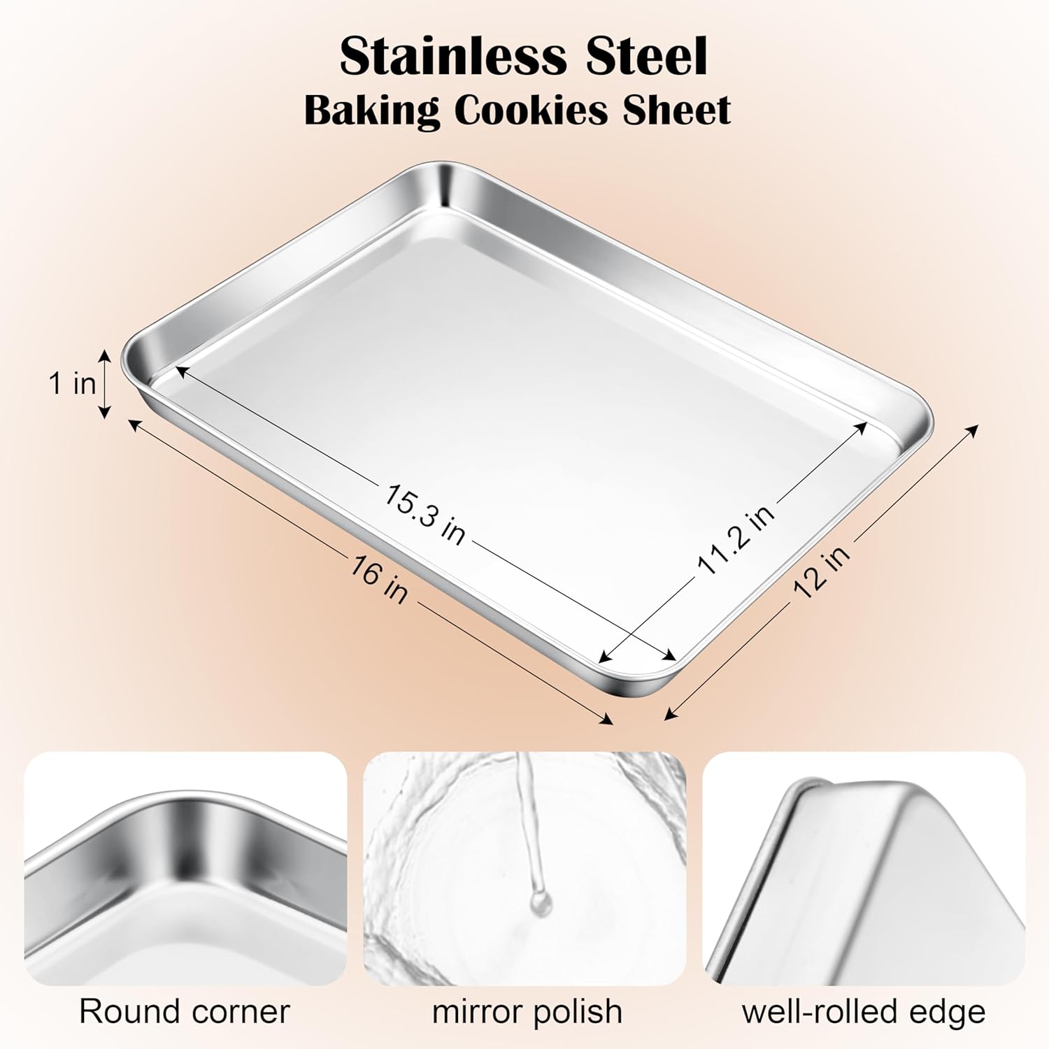 E-far Stainless Steel Baking Sheet, 16” x12” x 1” Baking Cookie Sheet Pan for Oven, Non-toxic Metal Trays for Baking Cake Cookie, Healthy & Rust Free, Mirror Finish & Dishwasher Safe, 1 Pack