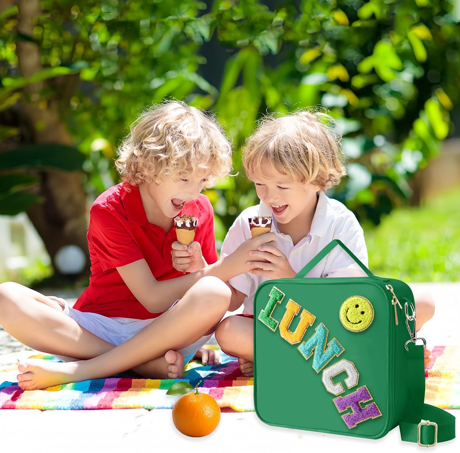 Insulated Lunch Bag With Adjustable Shoulder Strap, Nylon Preppy Lunch Box Large Insulated Lunch Bag Reusable Lunch Tote Bag with Smiley Preppy LunchBag for Girls School Travel Picnic (Dark green)