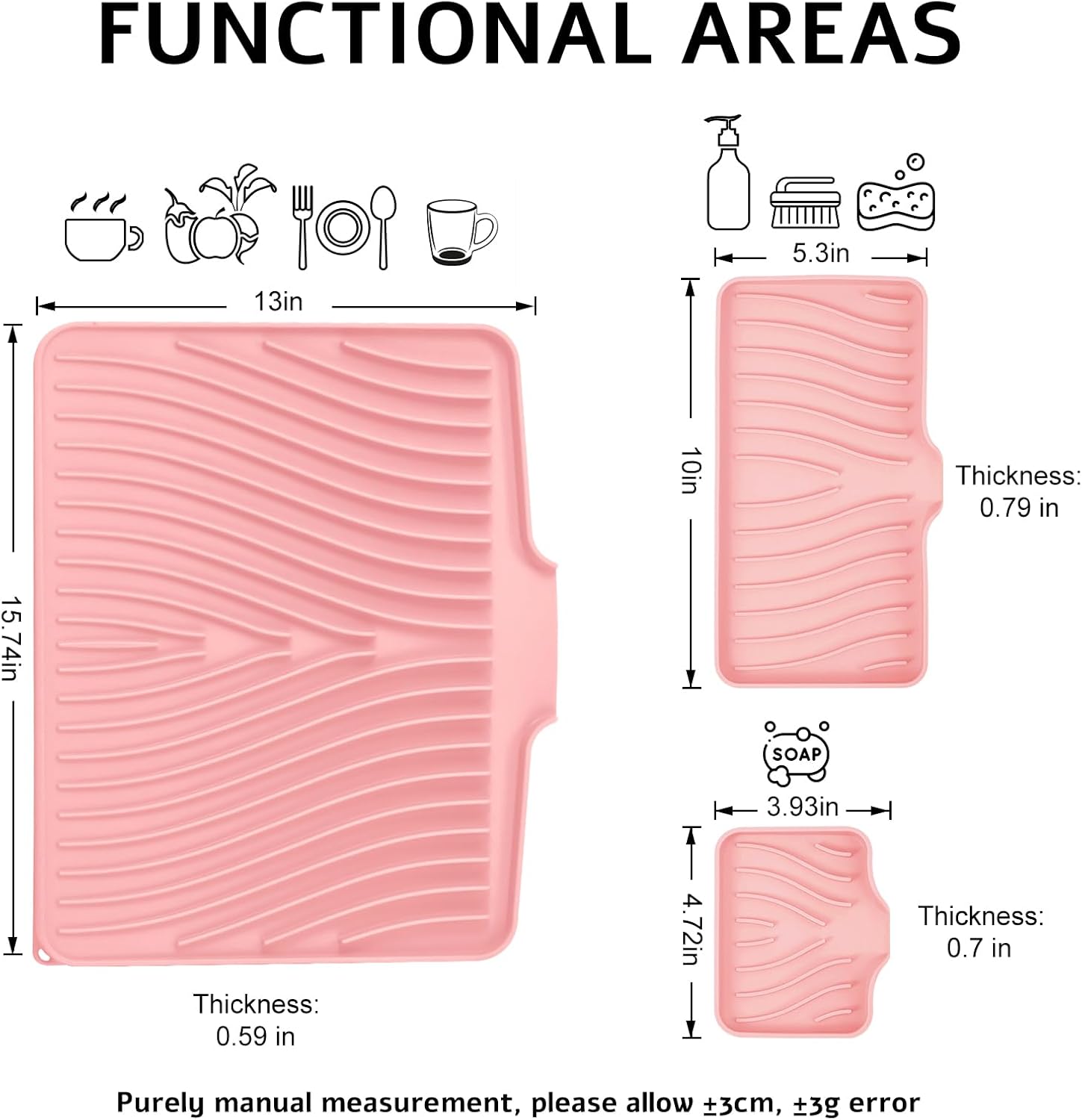 - Quick Drying Mat: TIKNIK dish drying mat measures 3 size, where washed dishes can be placed for air drying. The folding, raised and innovative design of the quick dry dish mat allows air to circulate under the dishes,and features unique diagonal ridges to easily remove moisture, and a specially designed rim that lets water drain directly into the sink. This keeps your countertops dry and clean, and says goodbye to wet countertops.