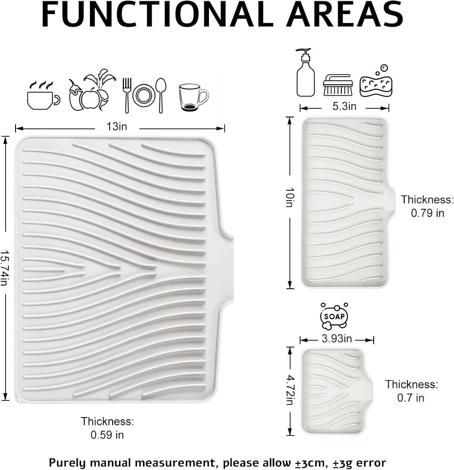 - Quick Drying Mat: TIKNIK dish drying mat measures 3 size, where washed dishes can be placed for air drying. The folding, raised and innovative design of the quick dry dish mat allows air to circulate under the dishes,and features unique diagonal ridges to easily remove moisture, and a specially designed rim that lets water drain directly into the sink. This keeps your countertops dry and clean, and says goodbye to wet countertops.