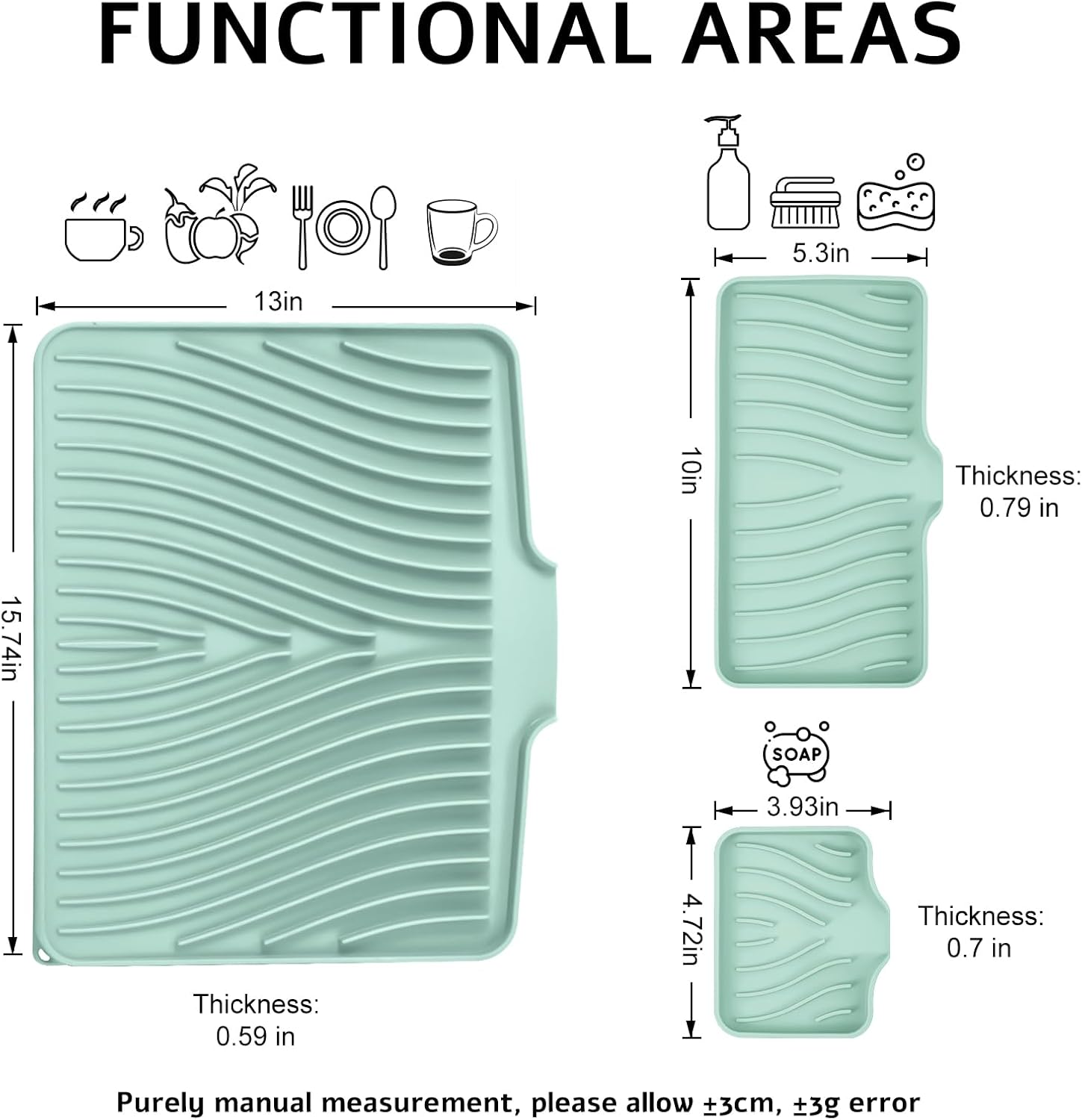Silicone Dish Drying Mat for Kitchen Counter, Dish Drying Pad, Non-Slip Drain Pad with Built-in Drain, Heat Resistant Stone Drying Mat, 3 pcs (Mint)
