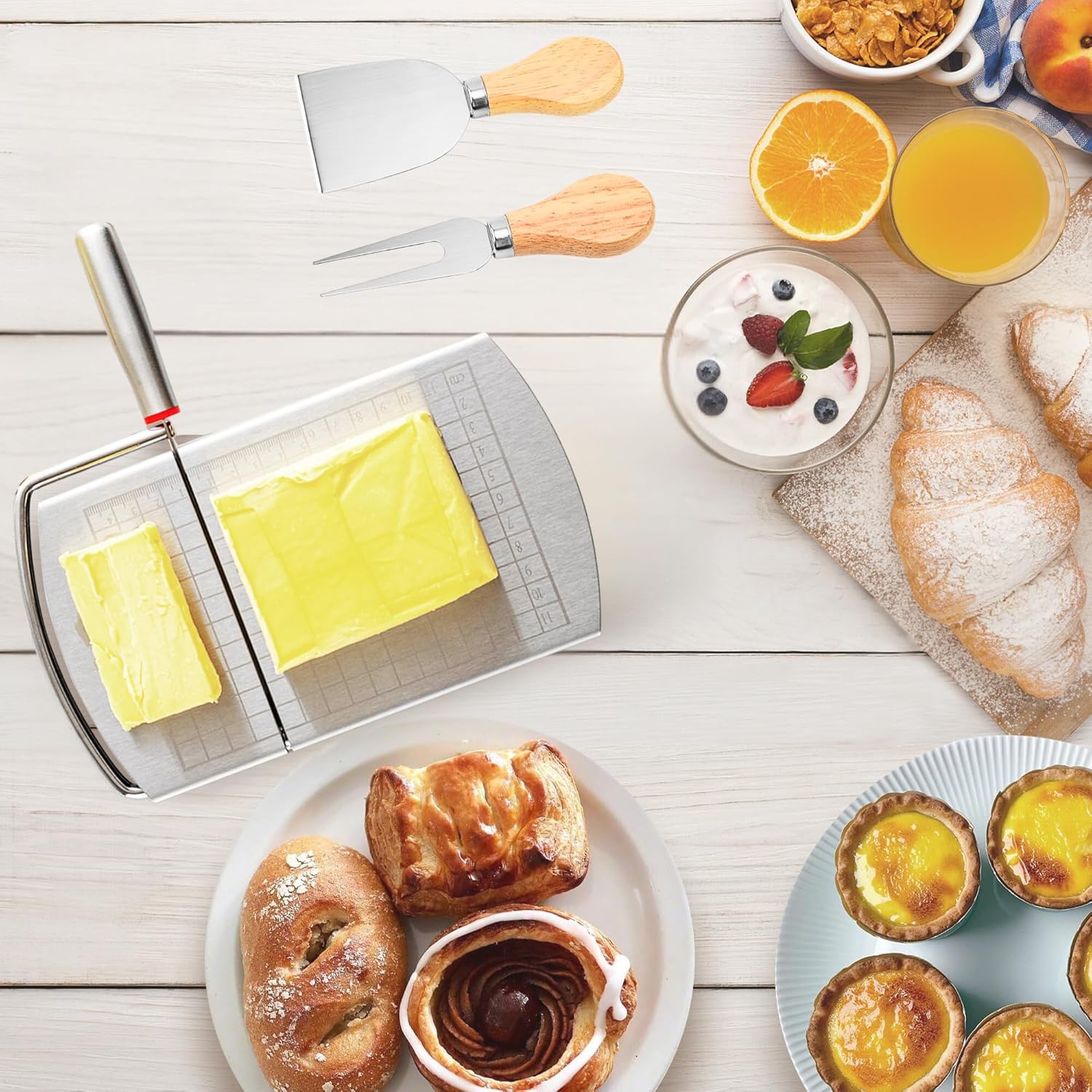 - 【Cheese Slicer With 2Pcs Cheese Knife】Cheese slicer board with Blade made of stainless steel material. Includes 2 pieces cheese knife with wooden handles and a cheese slicer, easy-to-cut soft cheese slices, butter, ham, or soft vegetables like cucumbers, onions and fruits