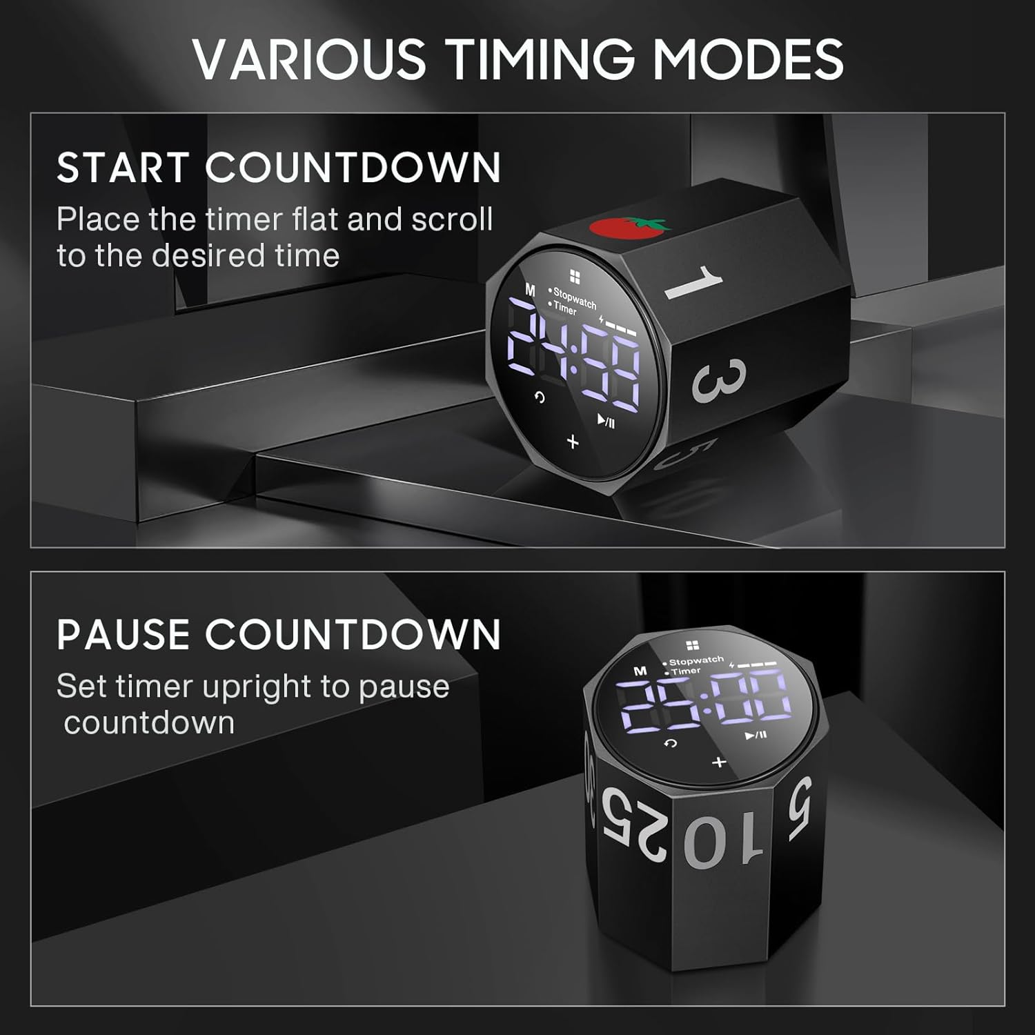 Digital Pomodoro Timer,Frosted Metal Productivity Cube Timer,1.8 In LED Digital Large Screen and Auto-rotating Display,1/3/5/10/25/30/60min & Custom Time, Silent & Alarm,for Office, Study, Work(Black)