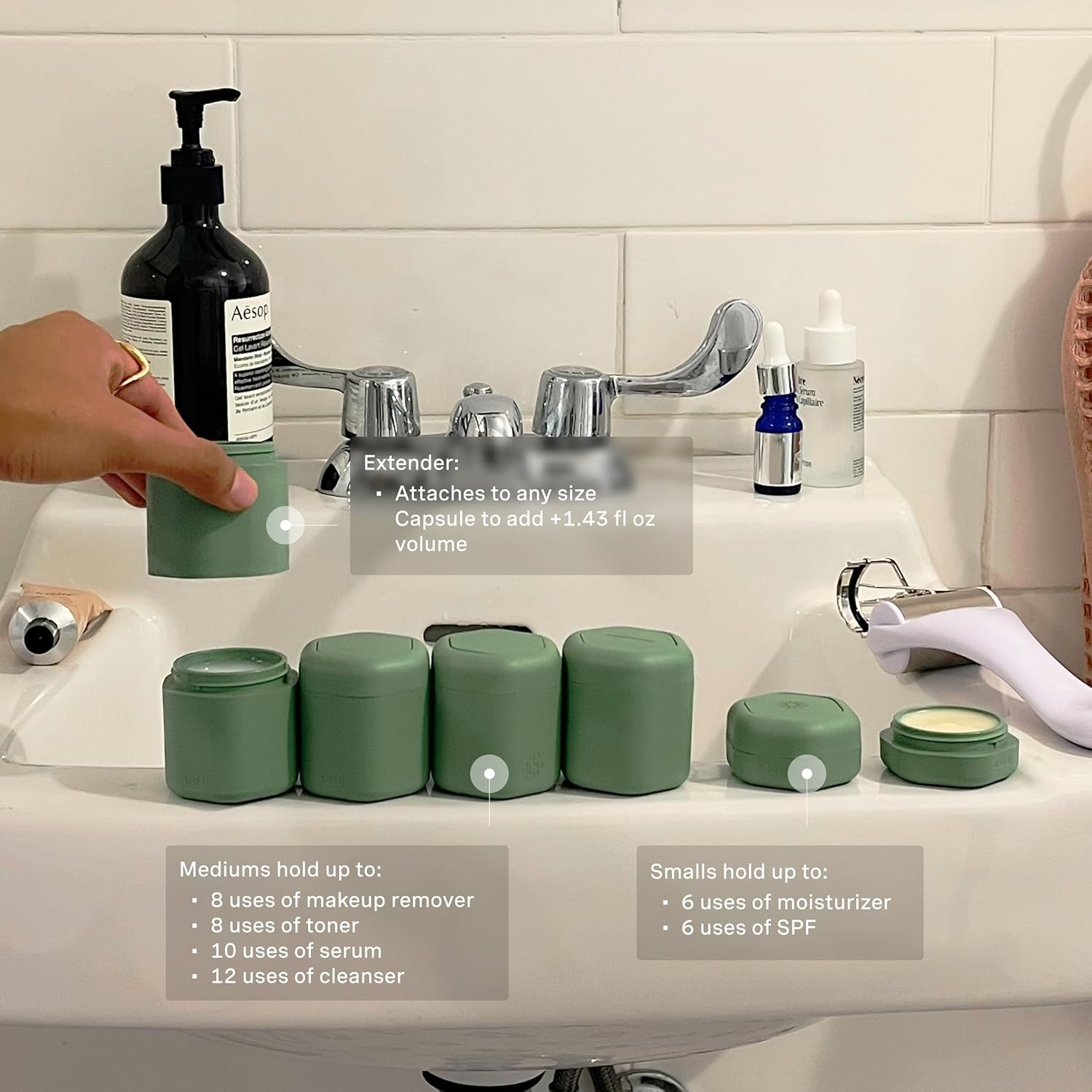 Cadence Travel Containers - Full Skincare Set - Magnetic Containers with Lids,Carry On Travel Essentials For Women/Men - 2 Small (0.56oz), 4 Medium Capsules (1.32oz), & Extender (1.43oz) - Eucalyptus