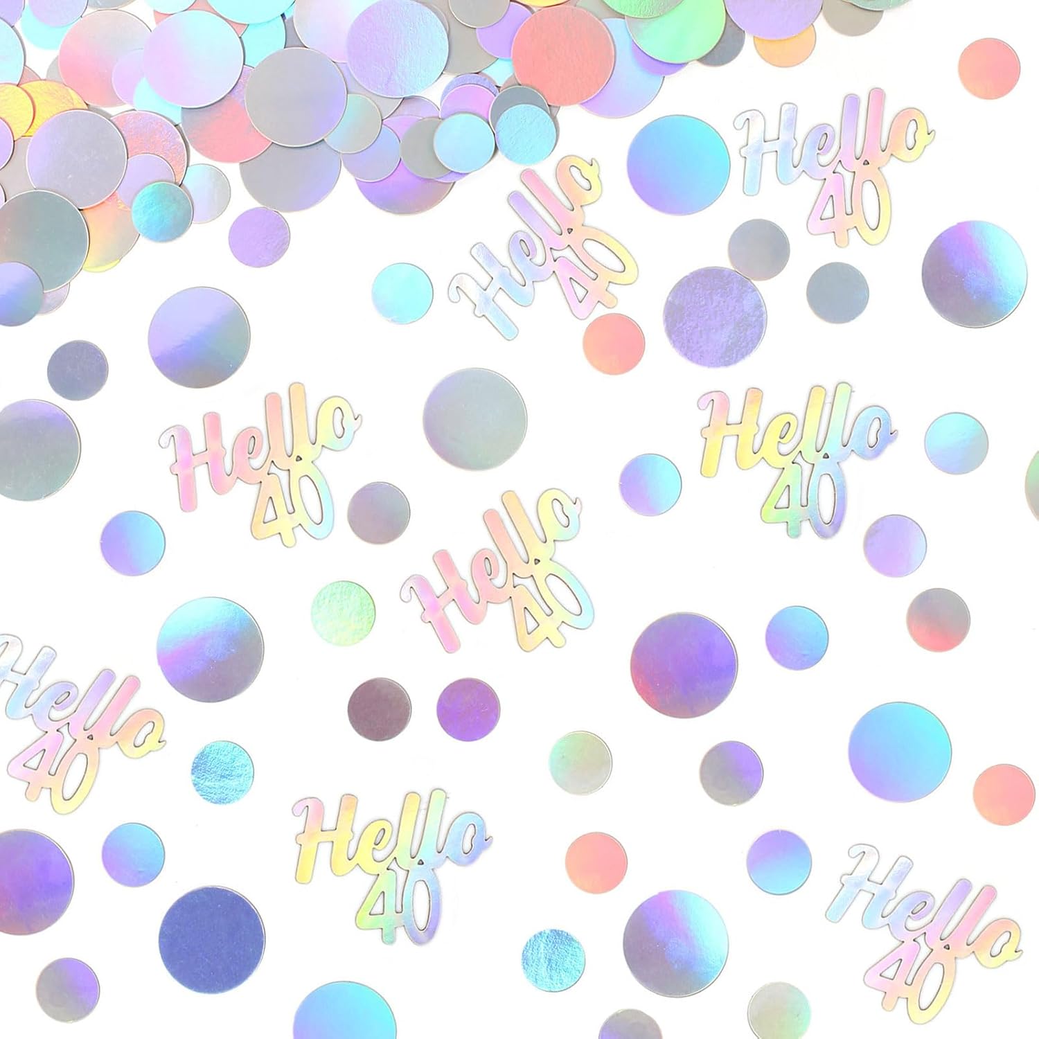 - Premium material, proper size and charming color.The cute biodegradable paper confetti is made from double sided silver foil paper card and well cut,the color is super amazing,looks like silver,but also like lots of pastel colors changing under the light. There is two sizes circles mix(1inch and 0.6inch),”Hello 40” letter confetti(1.6*1.3inch) ,recommend as table decorations or diy craft supply.