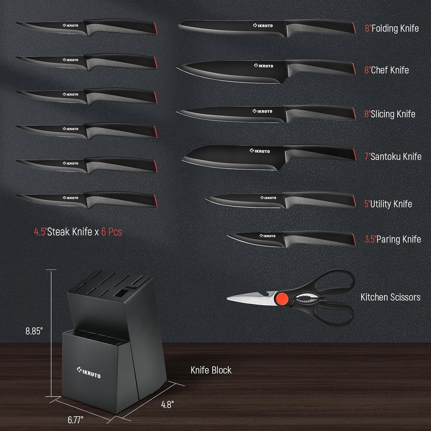 15-Piece Professional Kitchen Knife Set with Block – Built-in Sharpener, Anti-Slip Handles, Non-Slip Base – Effortless Cooking Tools for Chefs & Home Cooks (Black Red)