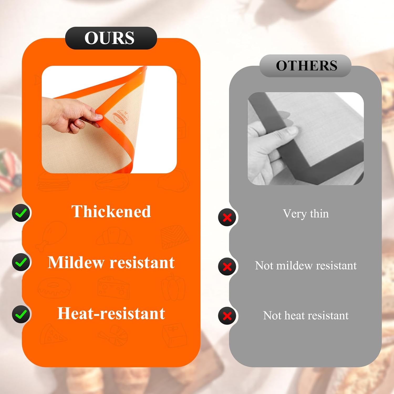 - High quality. Our baking mats are made from food-grade silicone, capable of withstanding repeated use without wear. They can be used in a temperature range from -40°F to 446°F, suitable for various baking and roasting needs.