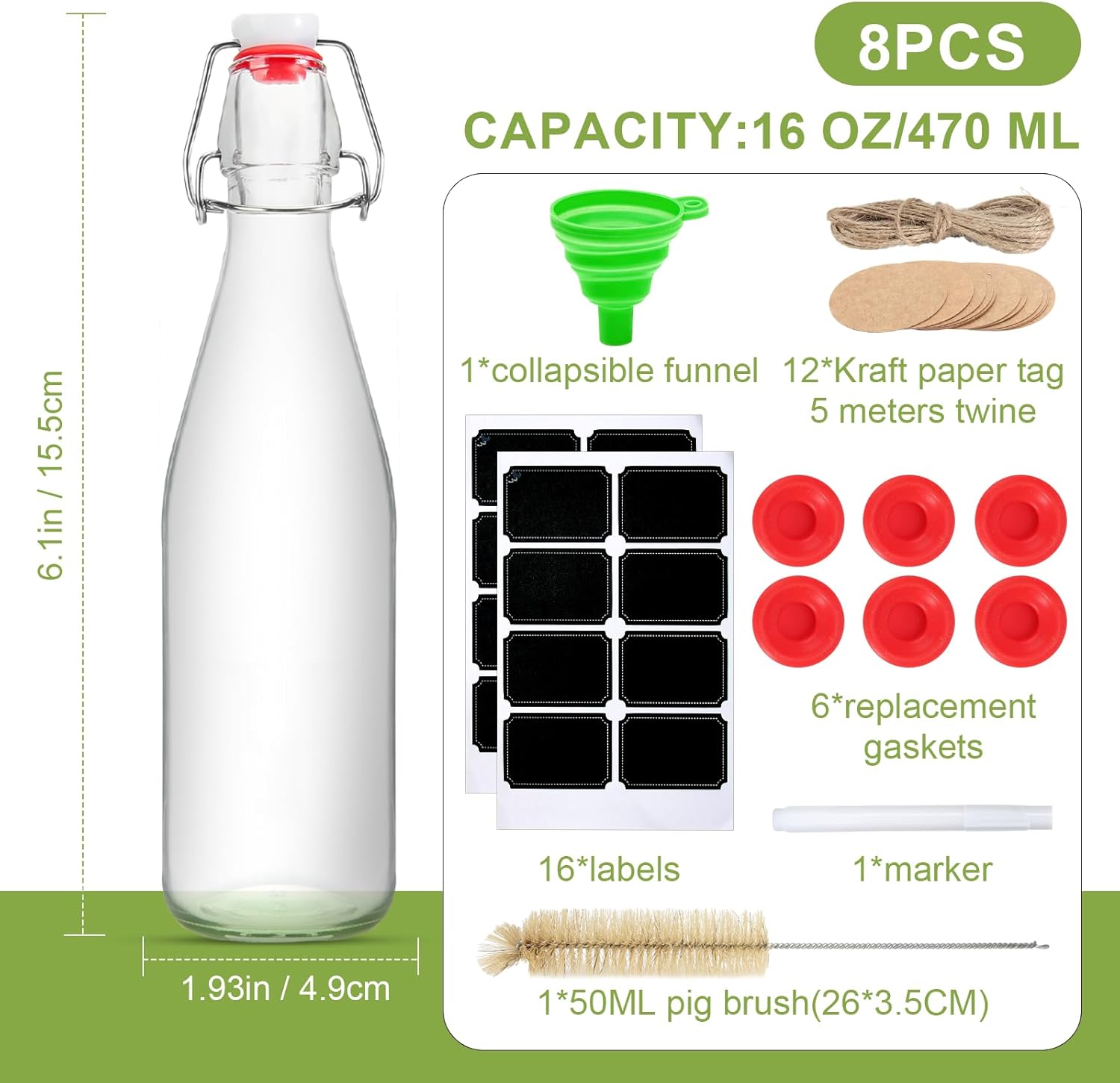 Ruckae 8 Pack 16oz Swing Top Glass Bottles with Air Tight Lids Kombucha Coquito Flip Top Glass Bottle Kefir Syrup Vanilla Extract Beer Brewing Bottles for Gift (16 oz 8 pack)