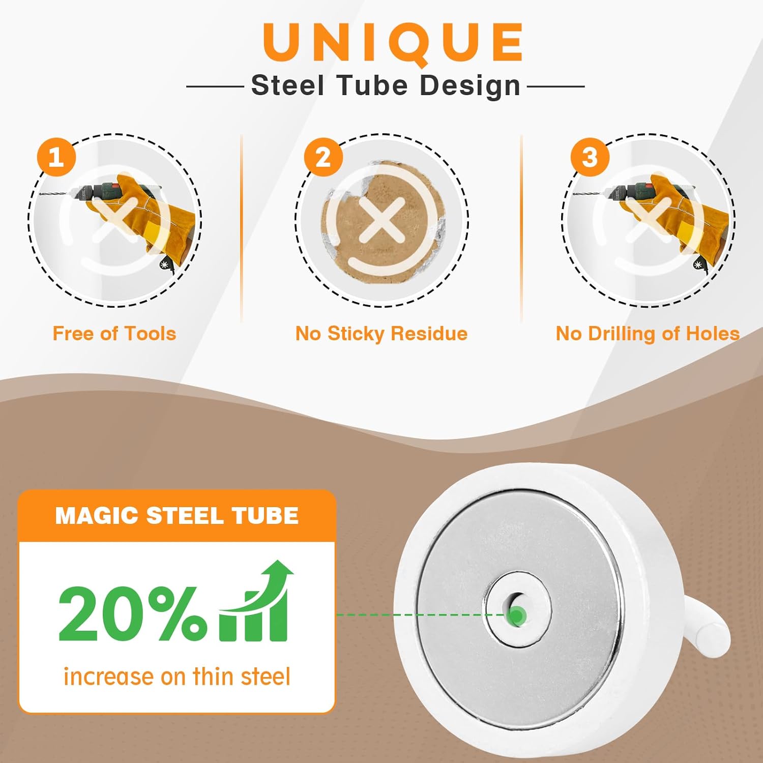 - ✔MAGIC STEEL TUBE DESIGN - Unique design of steel tube inside the base of magnetic hooks greatly increases the attractive force , especially on thin steel! It increase approximately 20% force comparing those none-tube magnets. it solves the problem of weak force on thin steel. Permanent magnetic hook with magic steel tube, strong magnetism lasts forever!