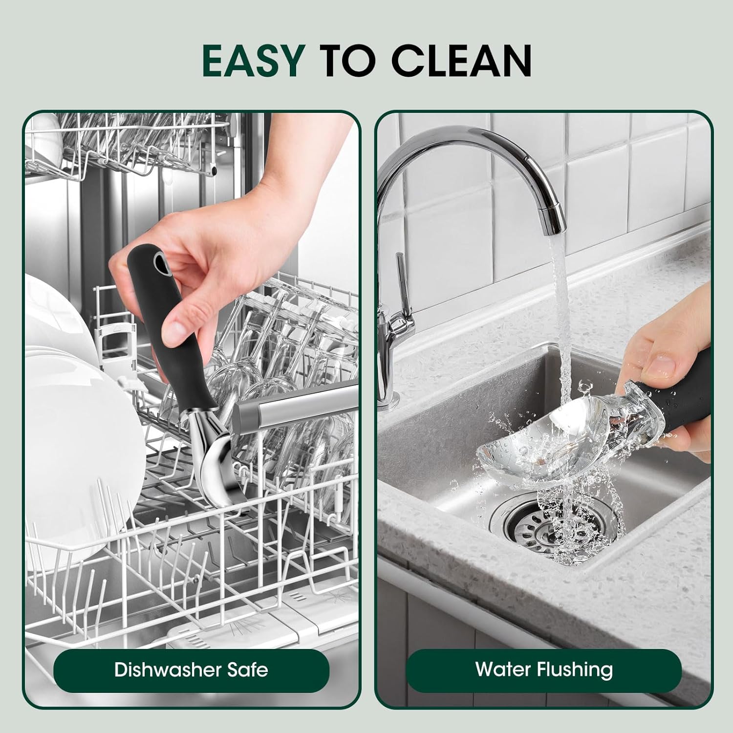 - Effort-Saving Extended Handle: Designed with a lengthened handle and an ergonomic concave arc for enhanced finger stability, this ice cream scoop ensures a stable grip while reducing wrist strain. The soft rubber-wrapped handle provides a comfortable, anti-slip hold for effortless use