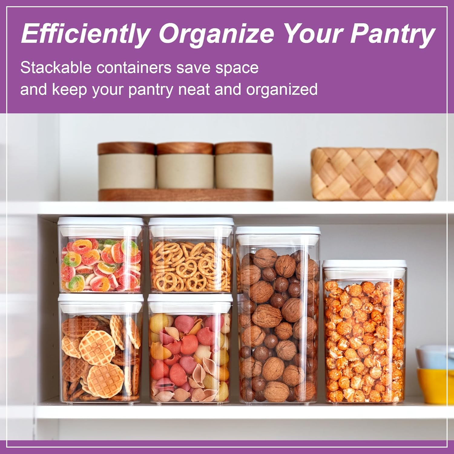 - [FRESHNESS IN] The silicone seal makes the canister airtight to keep in all the freshness, making it good storage for flour, sugar, cereal, pasta, coffee, tea, cookies, chips, nuts, snacks, and more. The stacking design makes it a super space saver for your kitchen and pantry shelf.