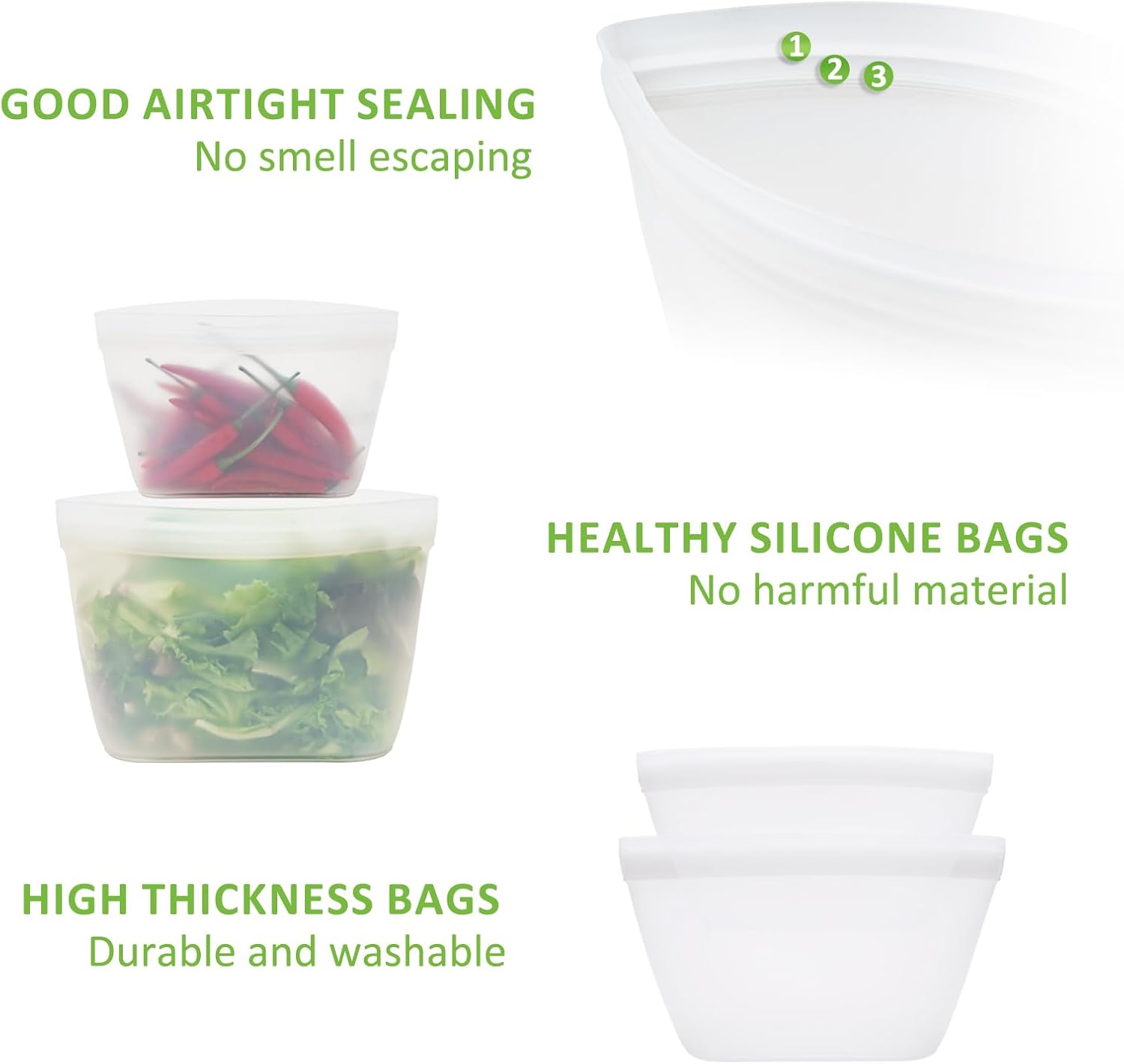 - 𝐆𝐑𝐄𝐄𝐍, 𝐒𝐀𝐅𝐄 & 𝐃𝐔𝐑𝐀𝐁𝐋𝐄 𝐌𝐀𝐓𝐄𝐑𝐈𝐀𝐋: Silicone bags for food storage are made of 100% food grade silicone, free from PVC, lead, chlorine and BPA. Non-toxic and odorless,eco-friendly safe for your family health.Besides,reusable ziplock bags with translucent body offers a glimpse inside.