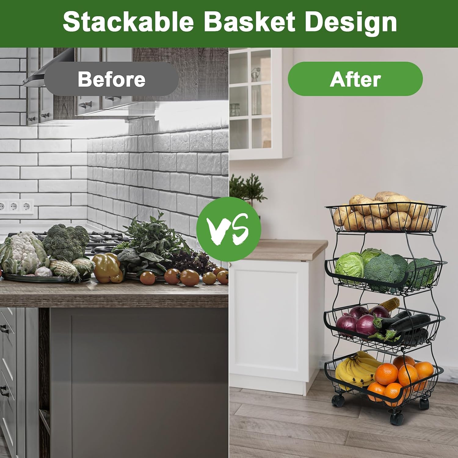- Stackable Storage Basket: Each layer of fruit baskets can be used on its own or stackable this will save your valuable space. Vegetable storage basket can be used as a fruit organizer, produce basket, retail display, veggies storage cart, books utilities rack, kids toys bins, baby food organizer, toiletries, office art supplies cart.