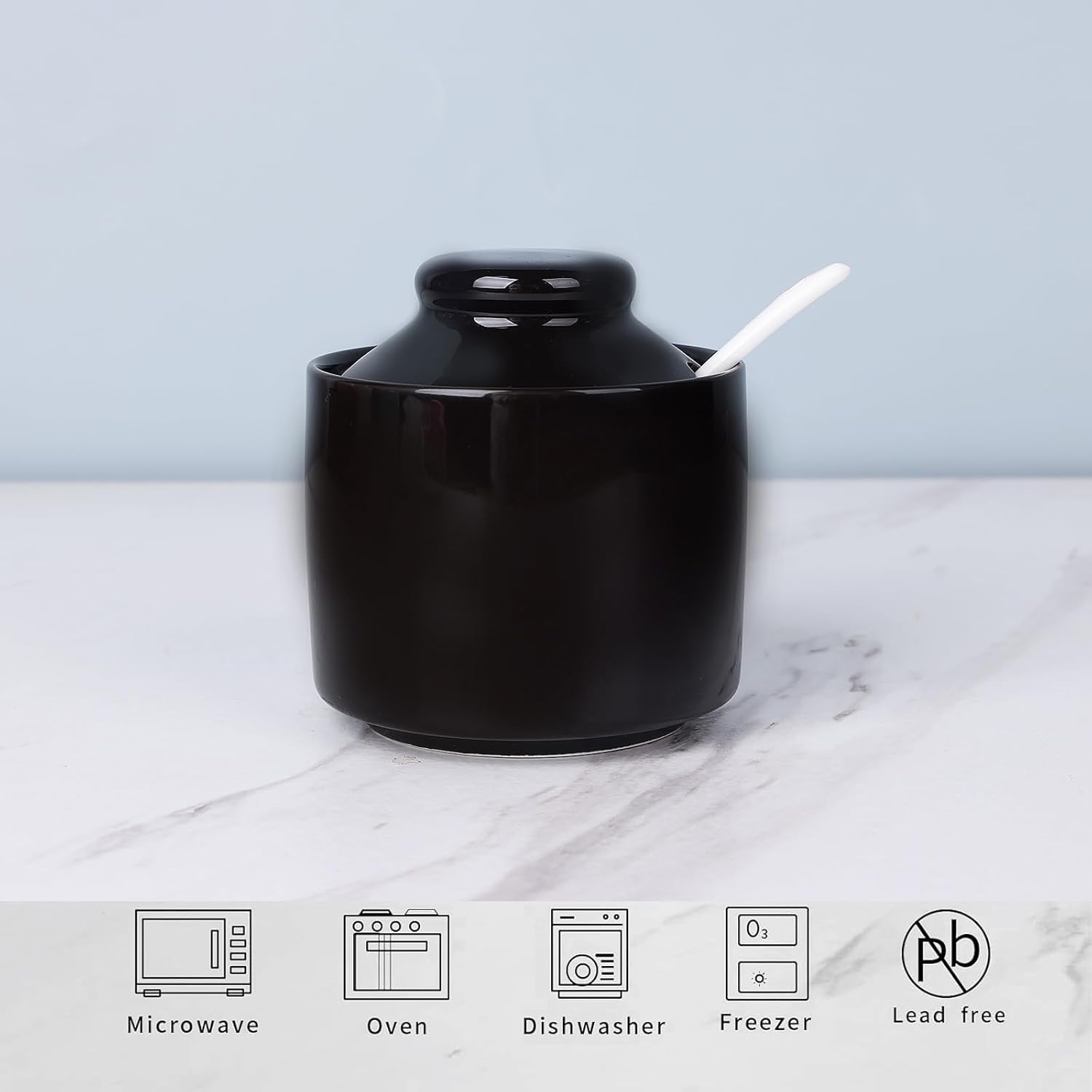 HAOTOP 8 oz Sugar Bowl with Lid and Spoon,Ceramic Sugar Jar Sugar Dispenser Sugar Container Coffee Bar Accessories, Kitchen Countertop Canisters (Black)