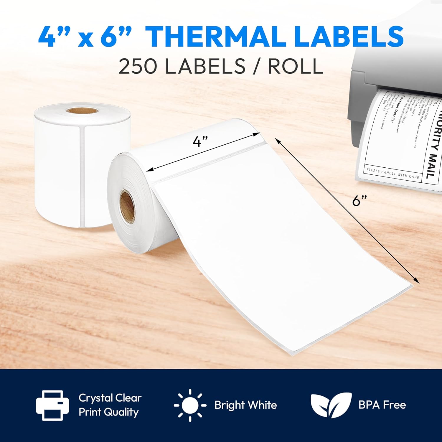 4x6 Direct Thermal Label, Barcode Address Mailing Name Shipping Labels, Perforated Thermal Stickers, Multipurpose, Commercial Grade for Thermal Printer, Strong Adhesive, 250/Roll, 4 Rolls