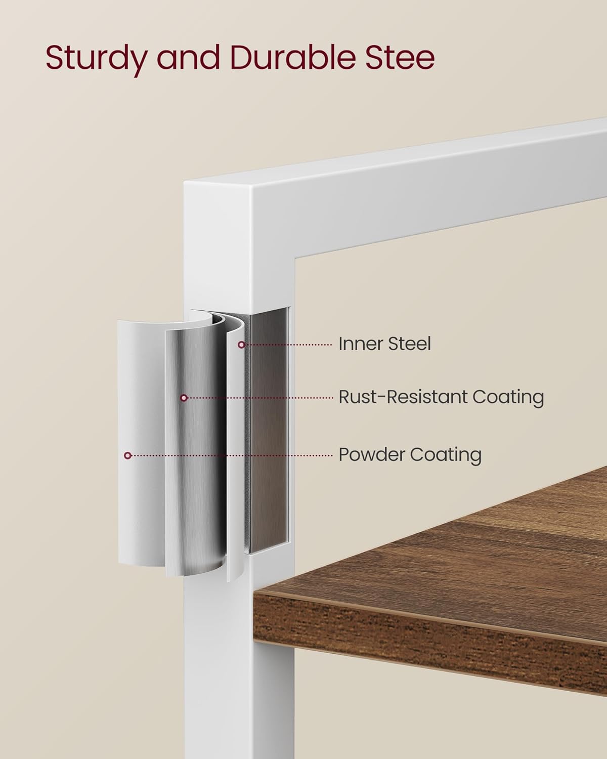 - Embrace an Industrial Vibe: The honey brown shelves paired with a white steel frame create a stylish industrial look, allowing this freestanding shelf to fit seamlessly in with your home decor and give your space an instant update