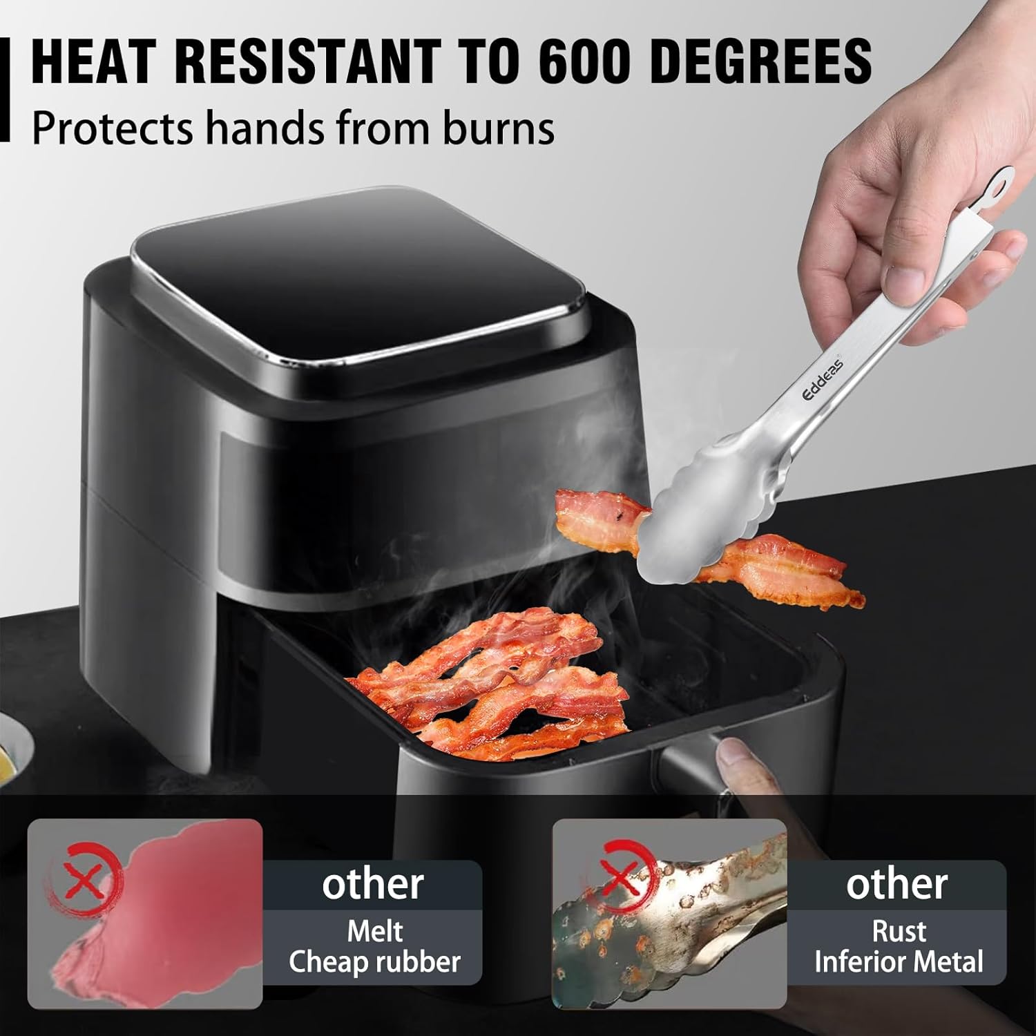 - FOOD-GRADE STAINLESS STEEL - EDDEAS kitchen tongs are made of 1mm thick food-grade stainless steel in one piece for enhanced robustness and heat resistance, rust resistance and easy handling. Tongs for cooking the overall light weight and ergonomic features are maintained.