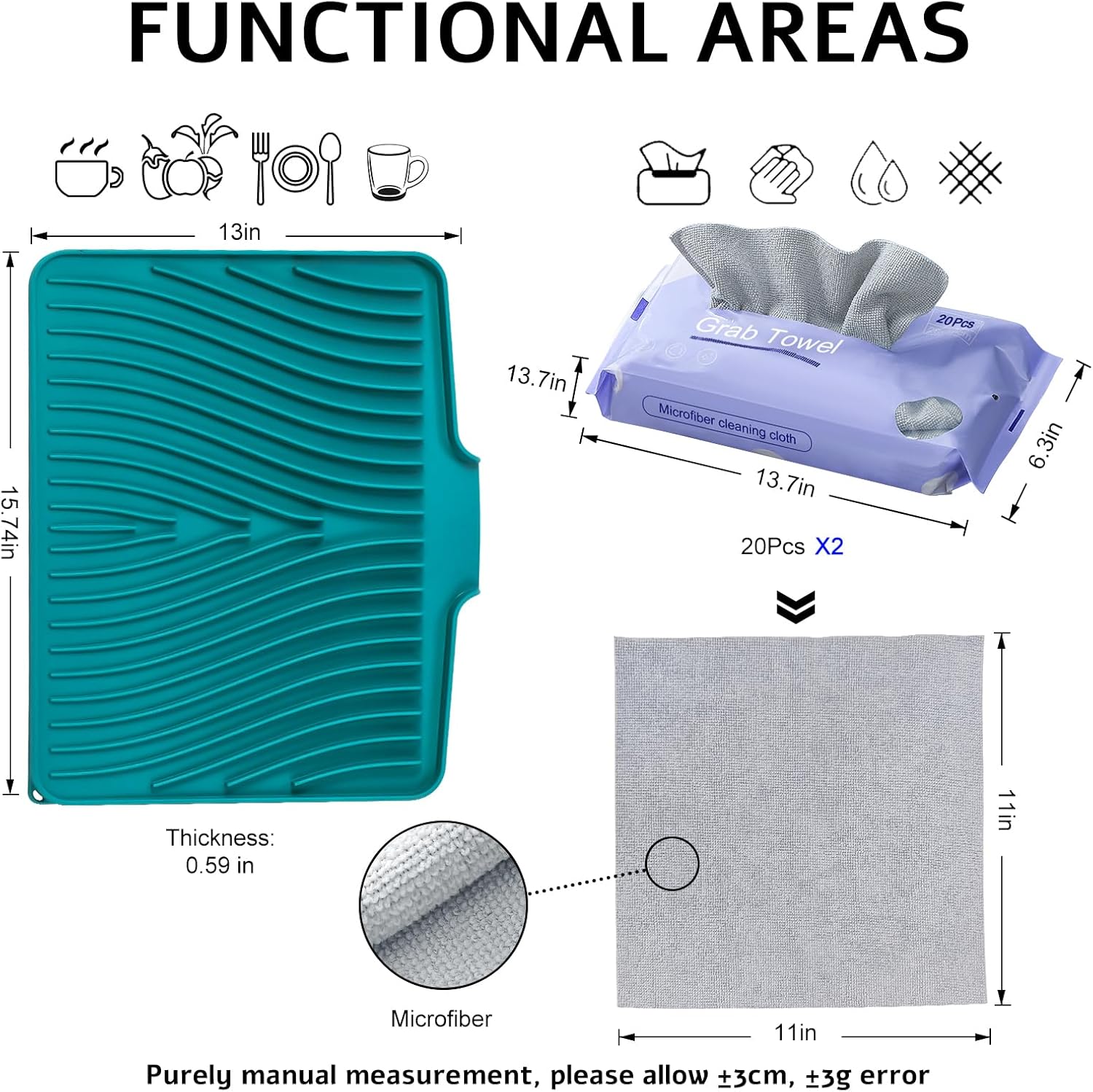 Silicone Dish Drying Mat, Stone Drying Mat for Kitchen Counter with Built-in Drain, Non-Slip 15.8" X 13" Drying Matt Kitchen Counter and Grey Microfiber Cleaning Cloth, Cleaning Rags Set(Green)