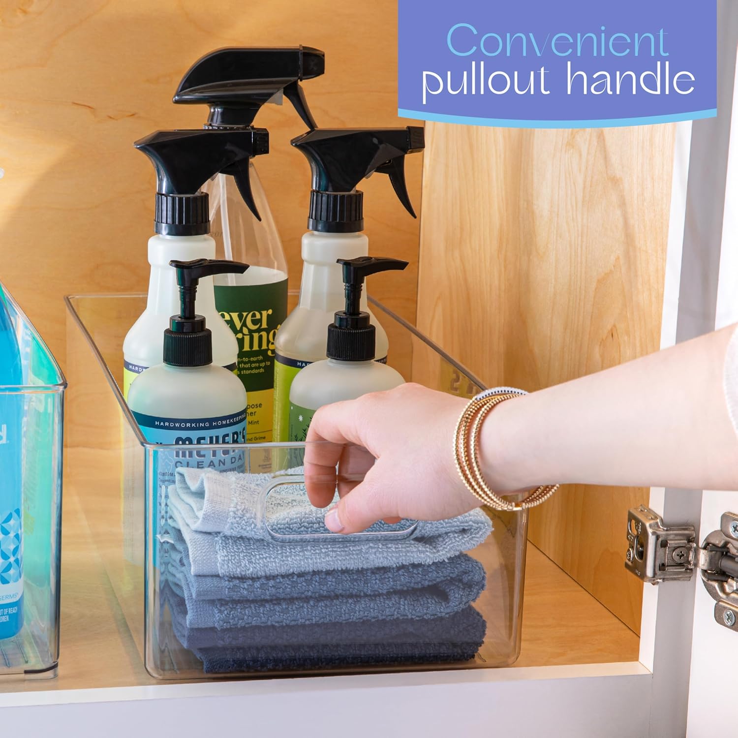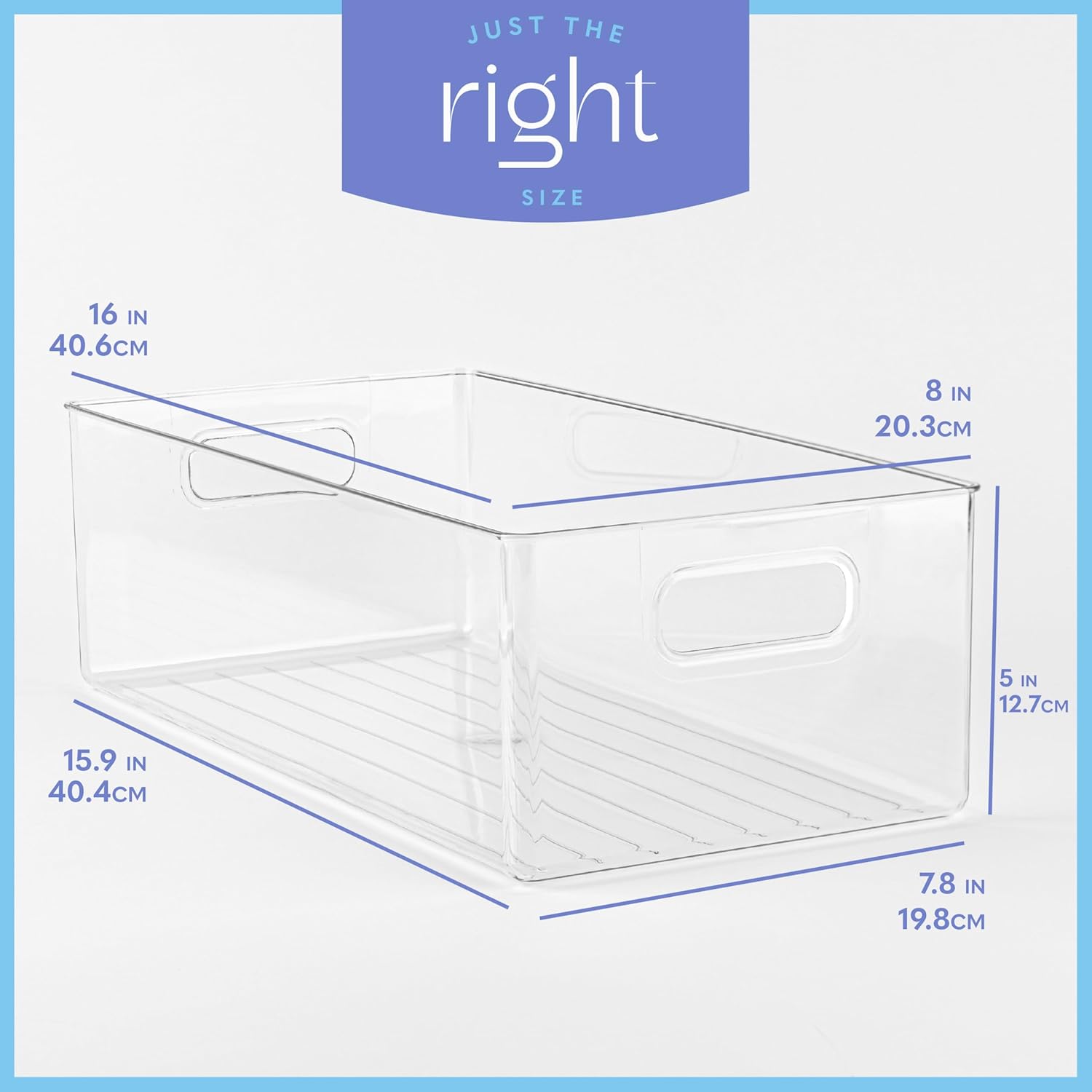 Plastic Food Storage 6 Pack Clear Container Bin with Handles for Organizing Kitchen, Pantry, Refrigerator, Freezer, Pantry, Cabinet, Closet, Bathroom. 16”x8”x5”