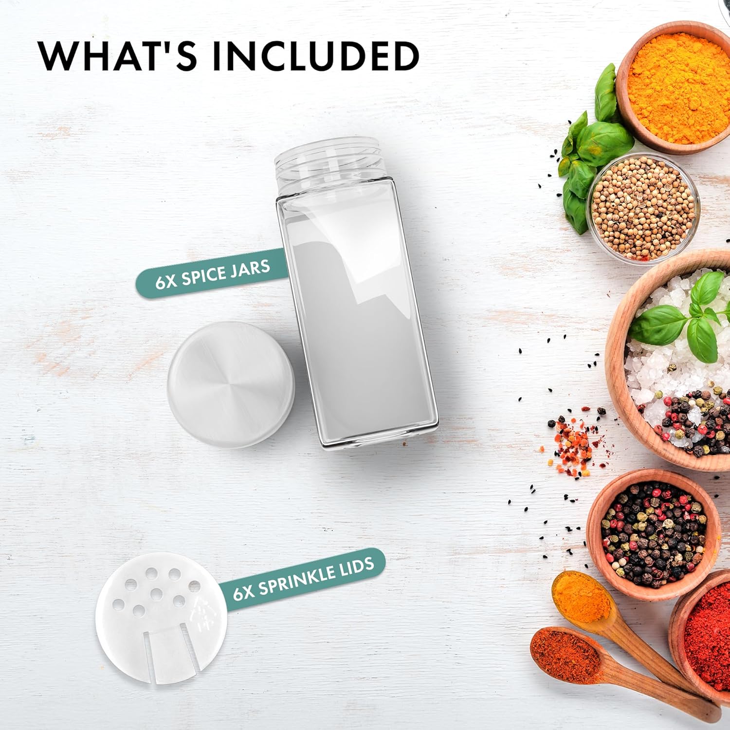 Glass Spice Jars and stainless Steel Lids (6 x 4oz) Spice Containers with Shaker Inserts - Add-On Pack Without Labels or Accessories
