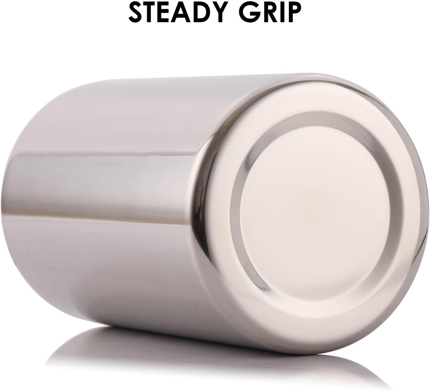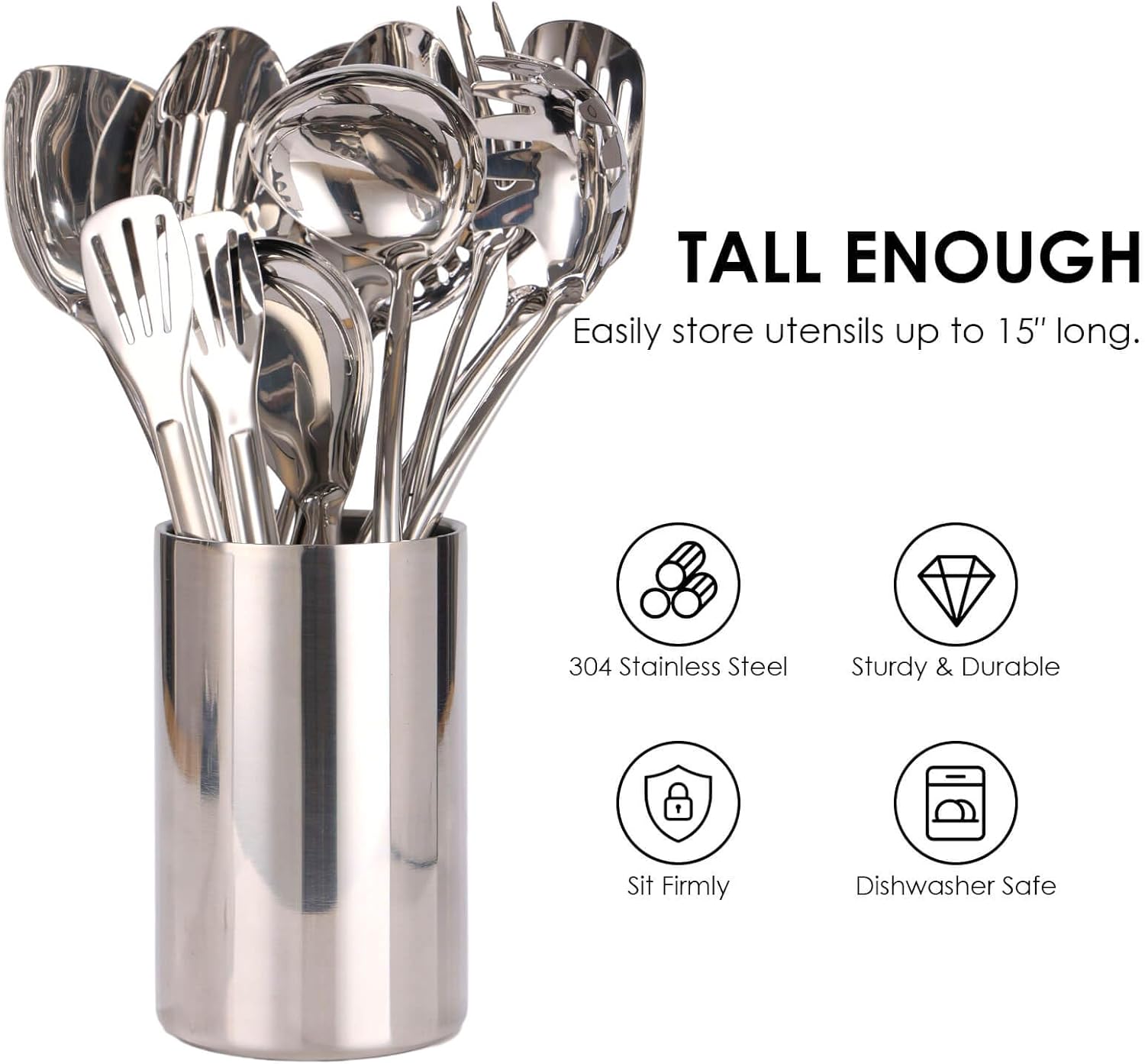 - Double wall stainless steel round storage bucket is large and tall body, 4.7" W x 7.5" H. Will sit firmly on countertop, conveniently access any and all kitchen utensils while cooking, serving, or grilling, won’t slip, slide, or wobble