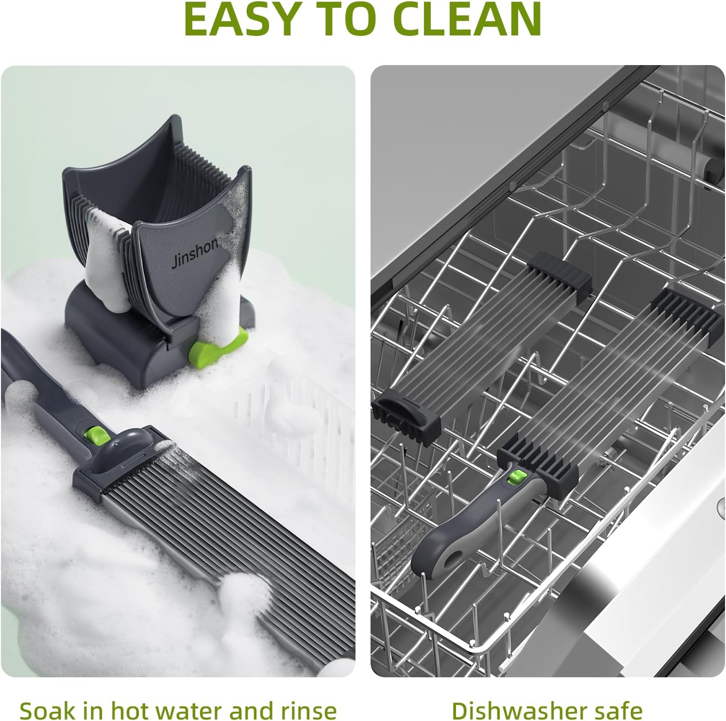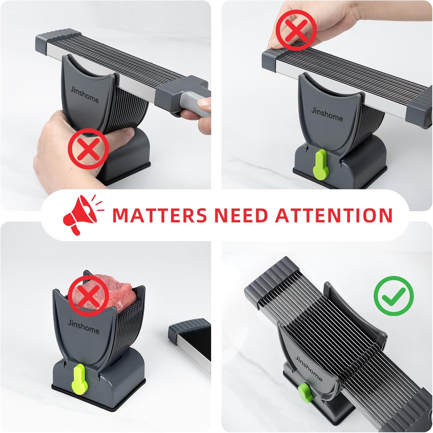 - 【SAWING MOTION + Adjustable Thickness】: You have to slide the knife from before to after, you need to go back and forward on meat, like a normal saw. with 17 blades, this slicer easily cuts an entire piece of fresh meat into 18 thin slices in one go. with 2 sets of blades, allowing you to flexibly cut meat slices at 2 or 4 millimeters. From thin to thick slices. By adjusting the direction of the meat, you can also slice it into different shapes, such as shredded meat, diced meat, or minced meat