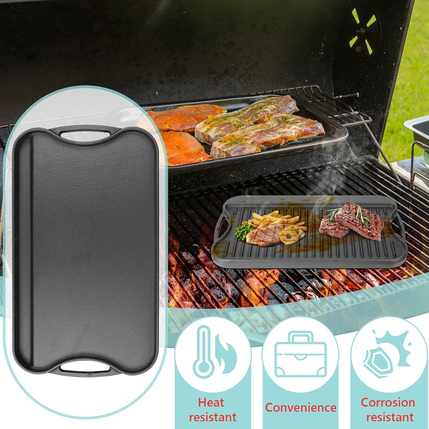 2 in 1 Reversible Cast Iron Griddle for Gas Grill, Flat Top Grill Pan for Gas Stove, Pre-Seasoned Oven Top pan,Upgrade Double Burner Griddle for Indoor & Outdoor Cooking Accessories, 17" X 10"