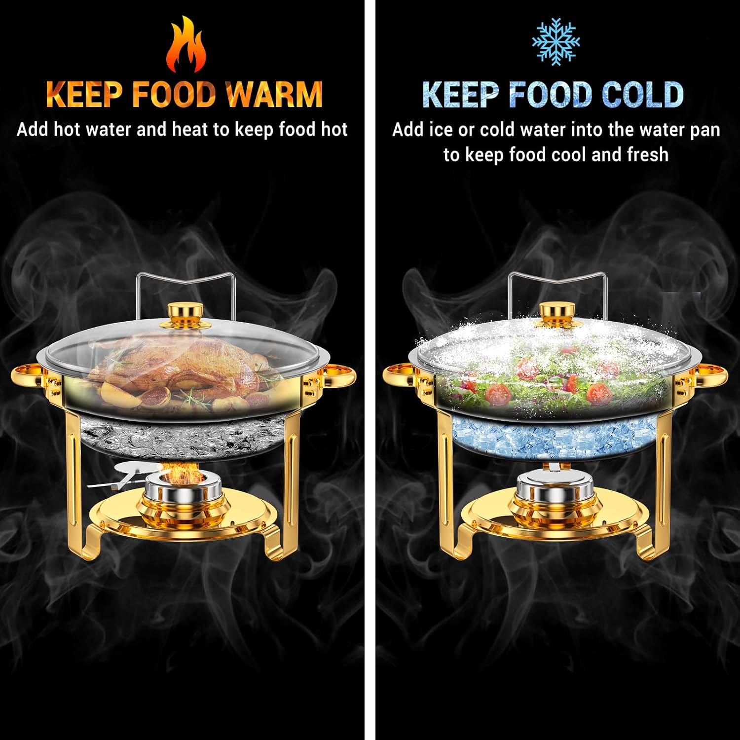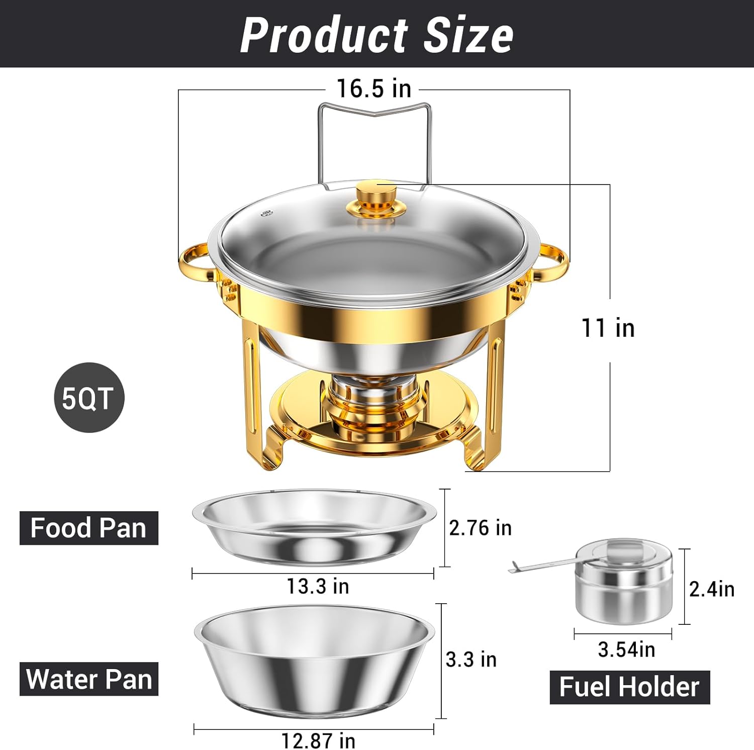 Round Chafing Dishes for Buffet 5 Qt,High Grade Chafing Dish Buffet Set, Full Size Pan,Rolled-Edge Design Food Warmers for Parties,Buffet,Wedding,Birthday,Camping 4 PACK (Gold-Glass)